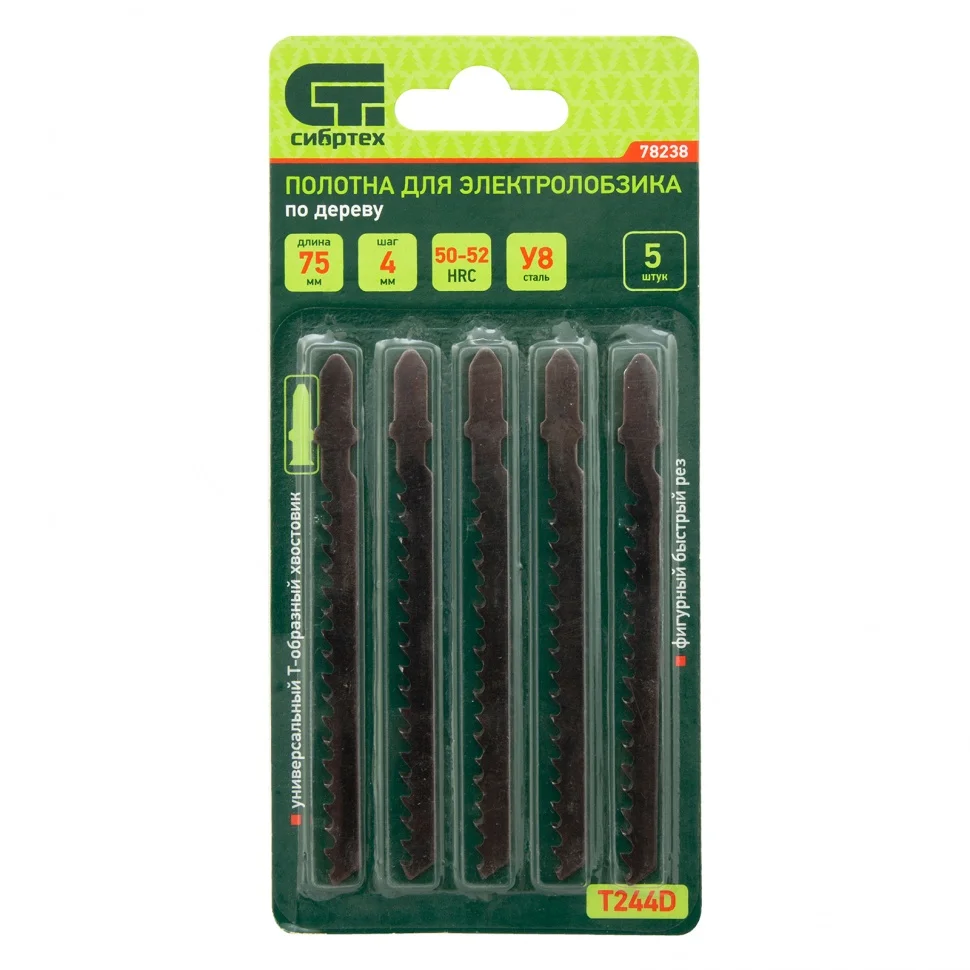 Полотна по дереву Сибртех 78238, 5 шт. T244D, 75 х 4мм, устанавливаются на электролобзики в качестве режущего элемента. Они помогают произвести быстрый рез деревянных конструкций. Полотна пригодятся мастерам при выполнении бытовых ремонтных работ.ПреимуществаПрочность и износостойкость — полотна изготовлены из высокоуглеродистой стали У8 и закалены до твердости 50-52 HRC.Шаг зубьев 4 мм — полотна обеспечивают точный и быстрый рез материалов.Удобная упаковка — индивидуальные кармашки для каждого изделия позволяют с удобством хранить набор и предотвращает образование коррозии.5 штук в упаковке — набора хватит надолго.