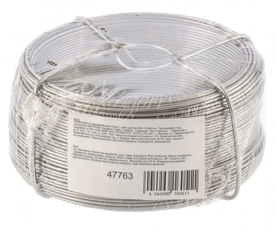 Проволока из нержавеющей стали Сибртех 47763 диаметром 1,2 мм и длиной 50 м имеет гладкую и блестящую текстуру, поэтому оптимально подходит для рукоделия. Также пригодится в быту для увязывания и фиксации предметов, изготовления сеток и рамок и т.д.ПреимуществаИзготовлена из нержавеющей стали, не окисляется, не боится перепадов влаги и температуры.Характеризуется жесткостью, за счет чего хорошо натягивается и не теряет форму.Поставляется в мотках по 50 м, запаса хватит на большой объем работ.