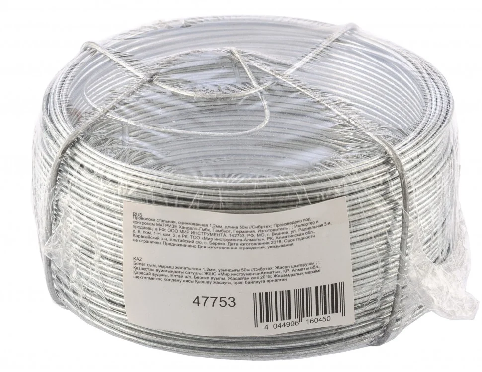 Стальная оцинкованная проволока Сибртех 47753 диаметром 1,2 мм и длиной 50 м рассчитана на бытовое использование. Пригодится для фиксации и связывания различных предметов, грузов, создания растяжек, также будет полезна при занятиях рукоделием.ПреимуществаНадежность — проволока из прочной стали легко натягивается и хорошо держит форму.Защита от разрушения — цинковое покрытие предотвращает образование коррозии.Длина 50 м — мотка проволоки на хватит для большого объема работ.