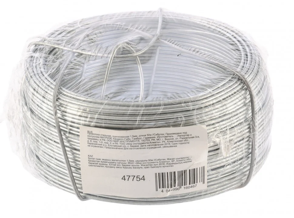 Стальная оцинкованная проволока Сибртех 47754 диаметром 1,5 мм и длиной 50 м рассчитана на бытовое использование. Пригодится для фиксации и связывания различных предметов, грузов, создания растяжек, также будет полезна при занятиях рукоделием.ПреимуществаНадежность — проволока из прочной стали легко натягивается и хорошо держит форму.Защита от разрушения — цинковое покрытие предотвращает образование коррозии.Длина 50 м — мотка проволоки на хватит для большого объема работ.