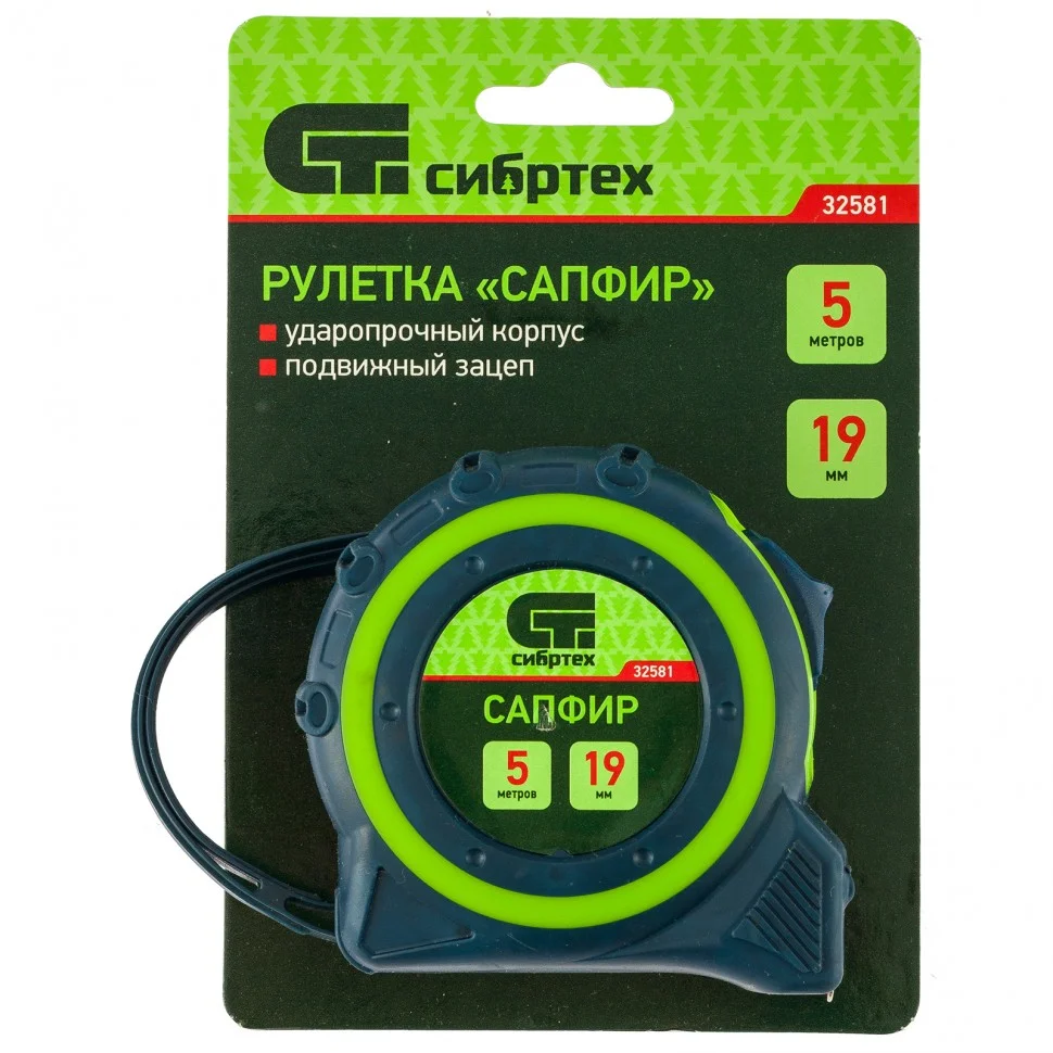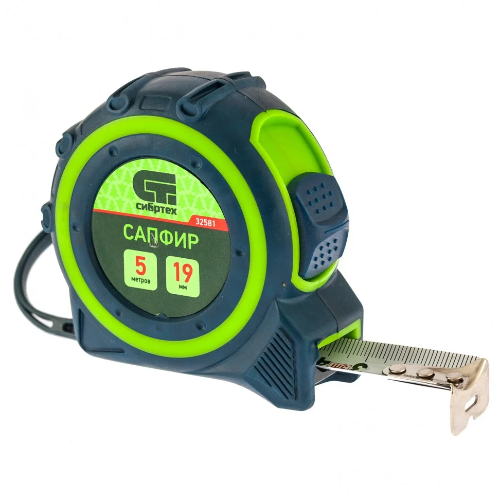 Рулетка Сибртех Сапфир 32581 с лентой 5 м х 19 мм выполнена в двухкомпонентном корпусе. Инструмент поможет определить длину заготовок, материалов, конструкций и т.д. Будет полезна дома, в гараже, мастерской, при проведении монтажных и ремонтных работ. Зацеп с отверстием позволяет использовать рулетку в качестве циркуля.ПреимуществаДвухкомпонентный корпус отличается ударопрочностью и надежностью, т.к. выполнен из ABS-пластика с резиновыми вставками.Небольшая ширина полотна 19 мм позволяет работать в труднодоступных местах.Подвижный зацеп обеспечивает точность работы, компенсируя его толщину.Благодаря ремешку и клипсе рулетку можно подвешивать на запястье или пояс для удобства работы.