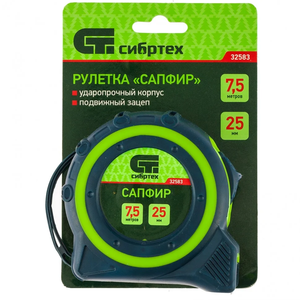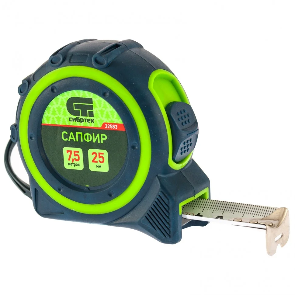 Рулетка Сибртех Сапфир 32583 с лентой 7,5 м х 25 мм выполнена в двухкомпонентном корпусе. Инструмент поможет определить длину заготовок, материалов, конструкций и т.д. Будет полезна дома, в гараже, мастерской, при проведении монтажных и ремонтных работ. Зацеп с отверстием позволяет использовать рулетку в качестве циркуля.ПреимуществаДвухкомпонентный корпус отличается ударопрочностью и надежностью, т.к. выполнен из ABS-пластика с резиновыми вставками.Подвижный зацеп обеспечивает точность работы, компенсируя его толщину.Благодаря ремешку и клипсе рулетку можно подвешивать на запястье или пояс для удобства работы.