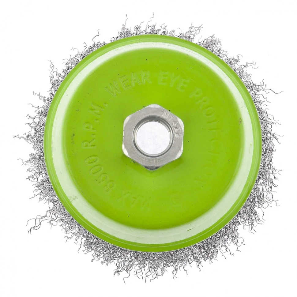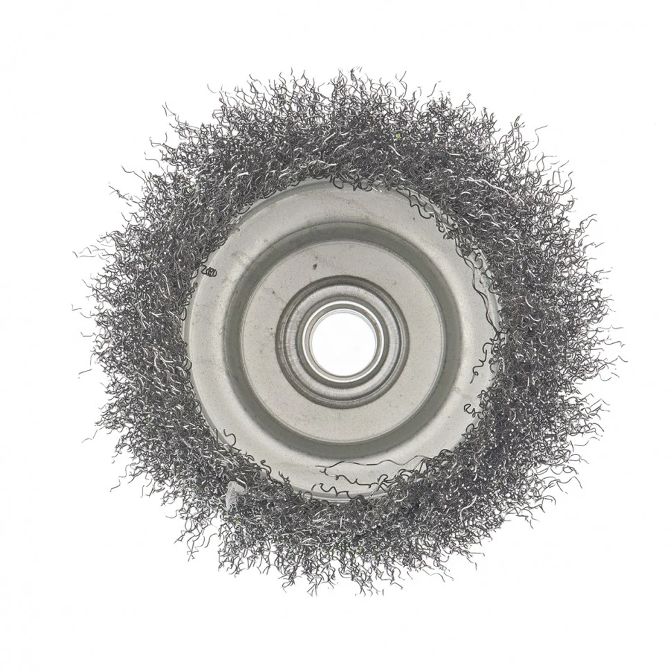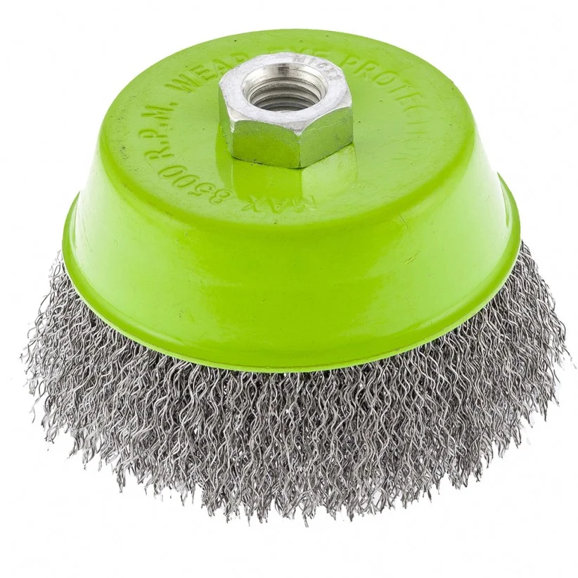Щетка для УШМ Сибртех «чашка» 746057, М14, диаметром 100 мм, с щетиной из витой проволоки 0,3 мм, предназначена для постепенного снятия тонкого слоя материала с металлических, деревянных и пластиковых поверхностей. Удаляет ржавчину, загрязнения, а также остатки краски и других покрытий. Подходит для обработки участков значительной площади. Щетку устанавливают на вал углошлифовальной машины (УШМ), рекомендуемая максимальная скорость вращения 8500 об/мин. Работать с оснасткой следует в спецодежде.ПреимуществаДеформационная стойкость щетины — витая проволока принимает исходную форму после снятия нагрузок.Защита от коррозии — корпус покрыт эмалью, а на щетину нанесено техническое масло.Быстрая установка и замена насадки — щетка крепится на вал УШМ при помощи гайки М14.