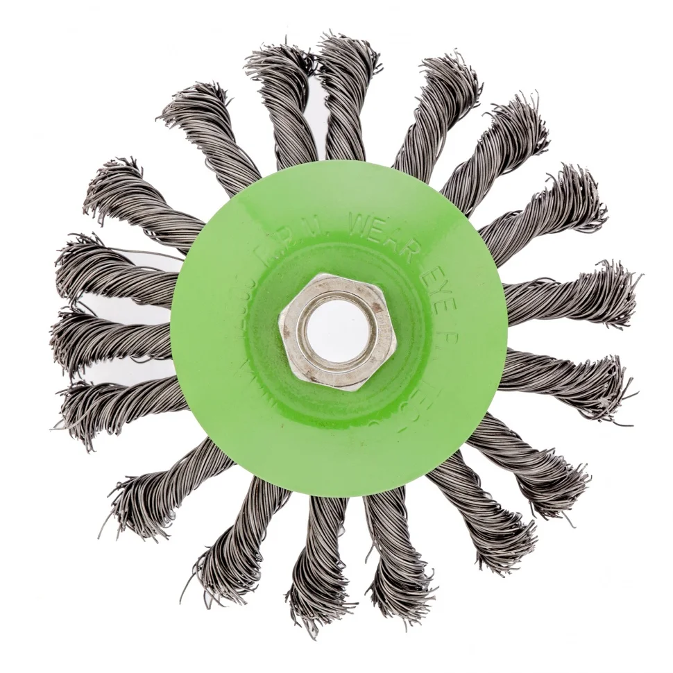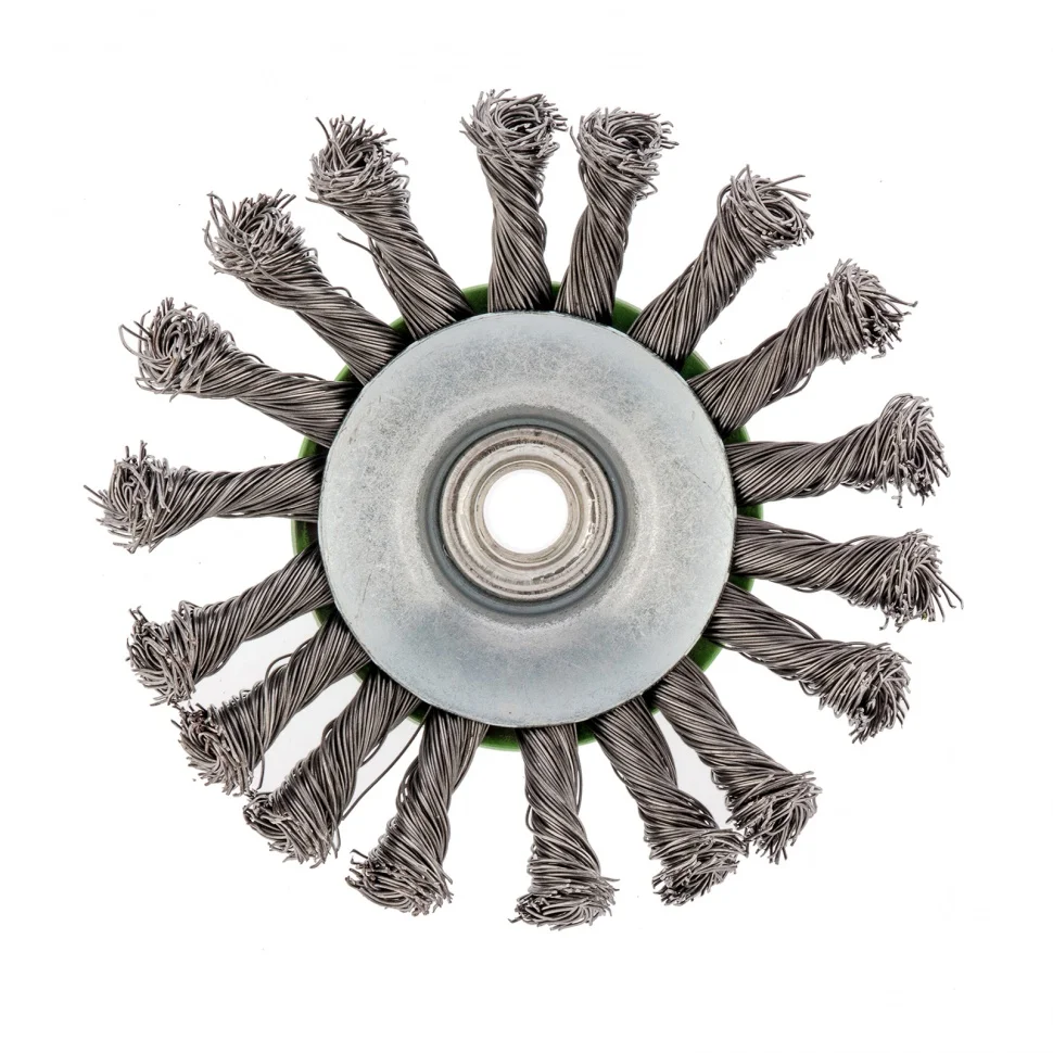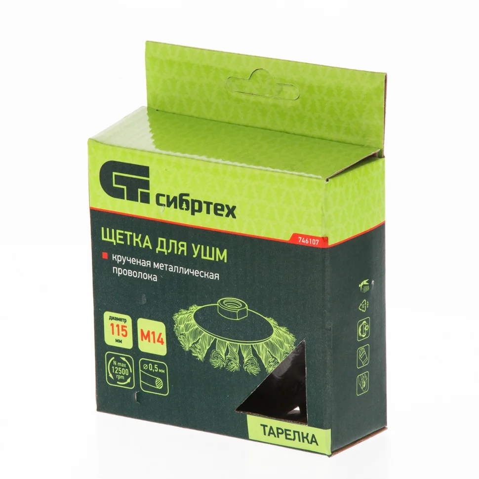 Щетка «тарелка» для УШМ Сибртех 746107 диаметром 115 мм, с крученой проволокой 0,5 мм и гайкой М14 — это универсальный инструмент для обработки плоских поверхностей и углов. Справляется с удалением ржавчины, загрязнений и старых ЛКМ. Щетка устанавливается в качестве оснастки на вал УШМ и рассчитана на эксплуатацию при скорости до 12500 об/мин.ПреимуществаВысококачественная стальная проволока — щетка прослужит долго.Крученая щетина — оснастка легко справляется с грубой (черновой) обработкой поверхностей, что позволяет снимать толстый слой материала.Универсальность — щеткой можно работать с любыми твердыми поверхностями: металлом, древесиной, пластиком и др.Стойкость к коррозии — эмалевое покрытие на корпусе и масляная пленка на щетине предотвращают появление ржавчины на щетке.
