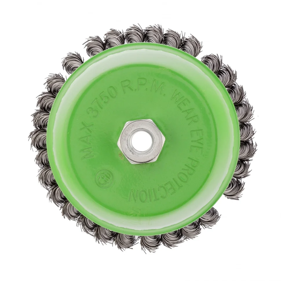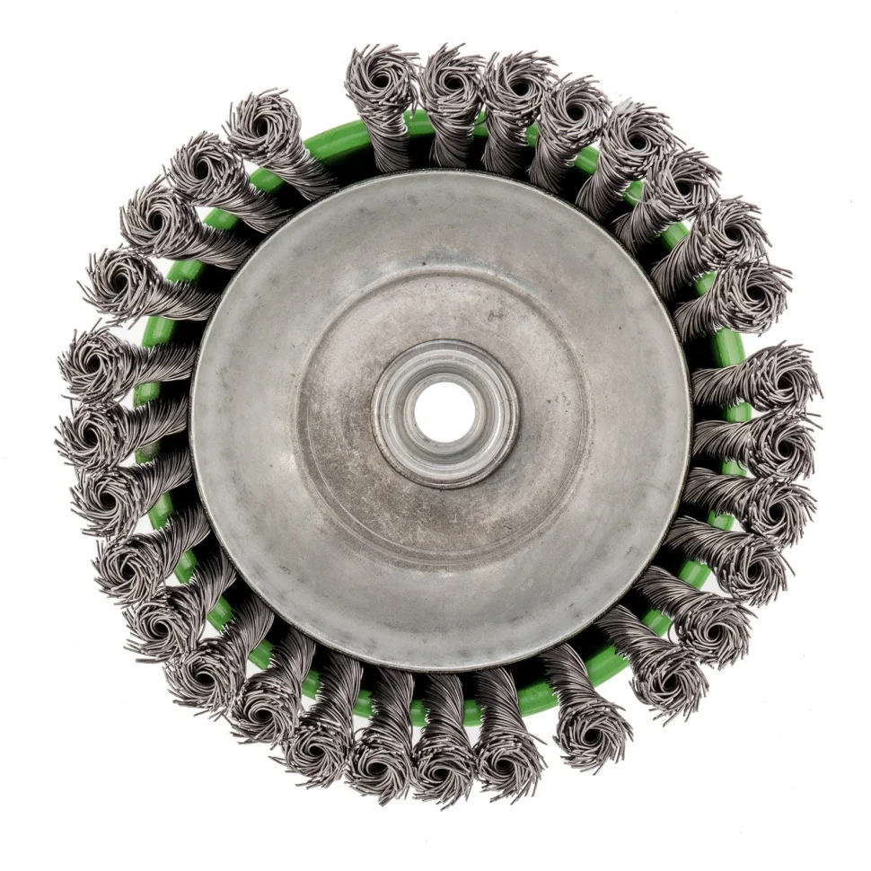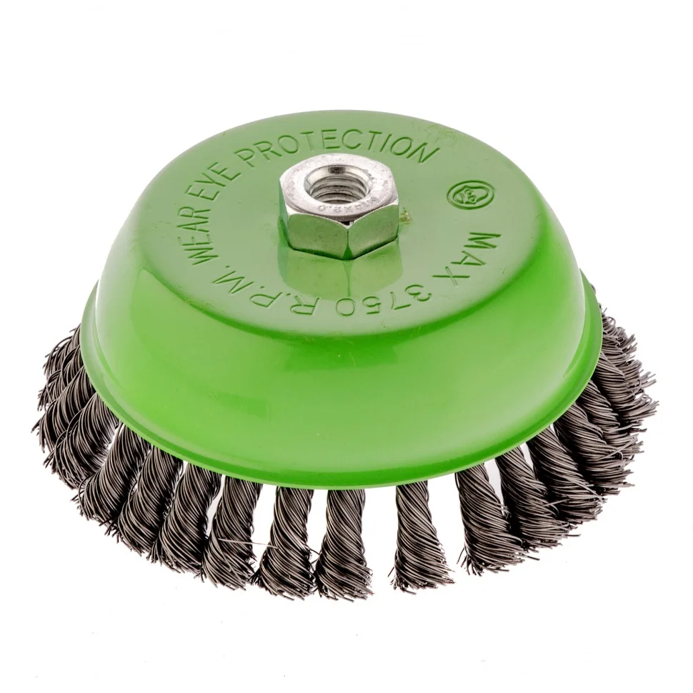 Щетка Сибртех «Чашка» 746297 диаметром 150 мм, М14, с крученой проволокой 0,5 мм, применяется в качестве оснастки на УШМ. Щетина рассчитана на грубую (черновую) обработку поверхностей. Изделие подходит для удаления загрязнений, снятия толстого слоя ржавчины, ЛКМ, зачистки сварных швов. Рекомендуемая скорость использования — 4500 об/мин.ПреимуществаБлагодаря высококачественной проволоке оснастка прослужит долгое время.Благодаря форме «чашка» насадка имеет большую площадь прилегания, поэтому оптимально подходит для обработки больших поверхностей.Щетку универсального назначения можно использовать для обработки любых твердых материалов: металла, древесины, цветных металлов, пластика и др.Корпус покрыт эмалью, а щетина — маслом, за счет чего щетка устойчива к коррозии.