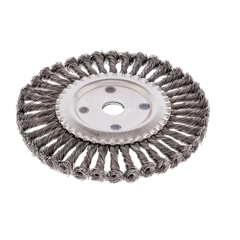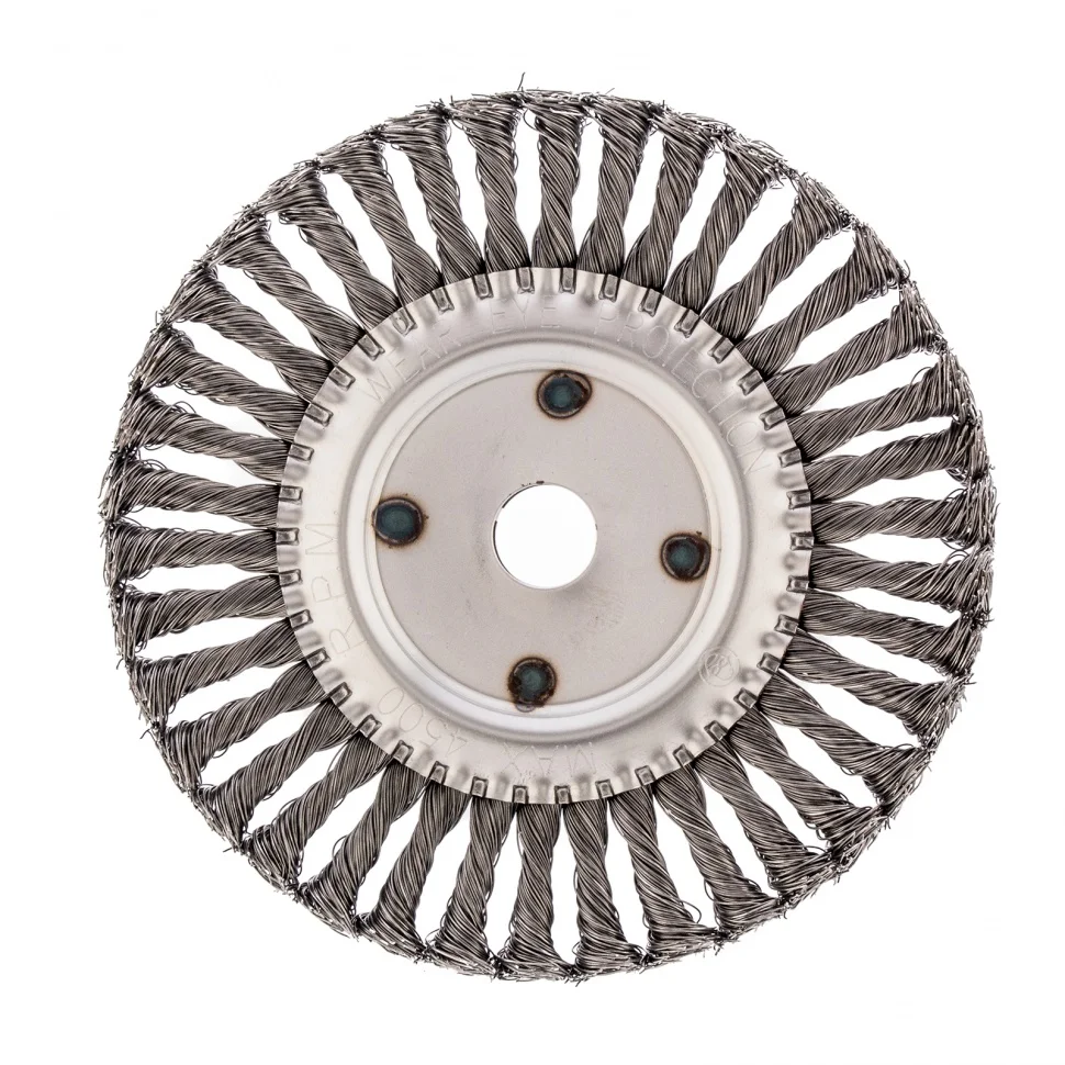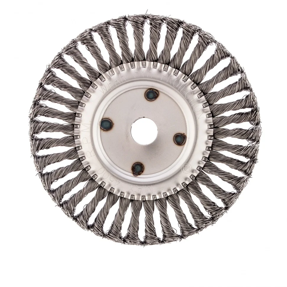 Плоская щетка Сибртех 746387 диаметром 200 мм и посадкой 22,2 мм, с крученой проволокой 0,5 мм, устанавливается на вал УШМ. Щетина с крученой проволокой эффективно удаляет толстый слой ржавчины, лакокрасочных материалов и загрязнения с поверхностей при проведении грубой (черновой) обработки. Плоская форма позволяет обрабатывать труднодоступные места, в т.ч. углы и изгибы. Рекомендуется использовать щетку на оборотах не более 6000 об/мин.ПреимуществаЗа счет высококачественной нержавеющей проволоки обеспечивается долговечность щетины.Универсальная щетка рассчитана на обработку твердых поверхностей из любых материалов: металла, древесины, цветных металлов, пластика и т.д.Щетку можно использовать вне помещений, т.к. щетина покрыта маслом, а корпус оцинкован.