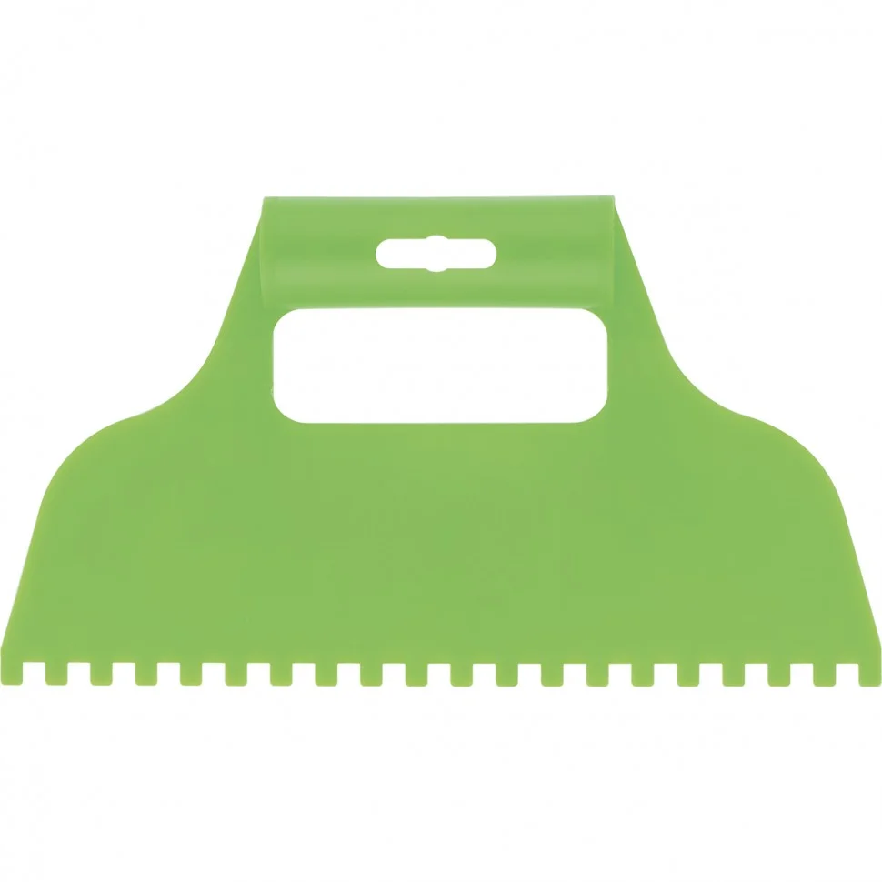 Пластмассовый шпатель для клея Сибртех 86015, зубчатый (квадратные зубья 6 х 6 мм), рассчитан на нанесение клеевых составов и их последующее выравнивание. Зубчатая рабочая часть позволяет равномерно наносить смесь для надежного соединения с плиткой и расходовать ее экономно.ПреимуществаЭргономичная рукоятка способствует удобному захвату инструмента и комфортной работе.В рукоятке предусмотрено отверстие для подвесного хранения шпателя.Небольшой вес инструмента предотвращает появление усталости в руках во время работы.