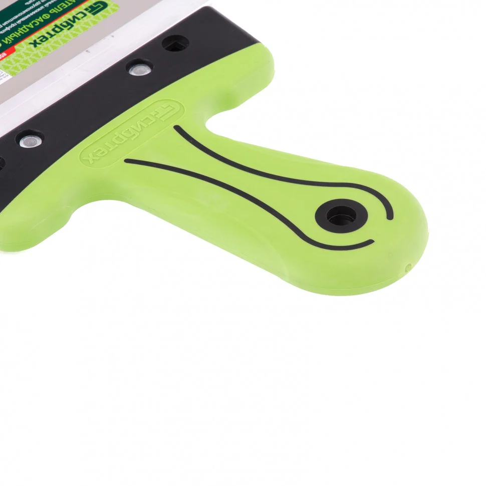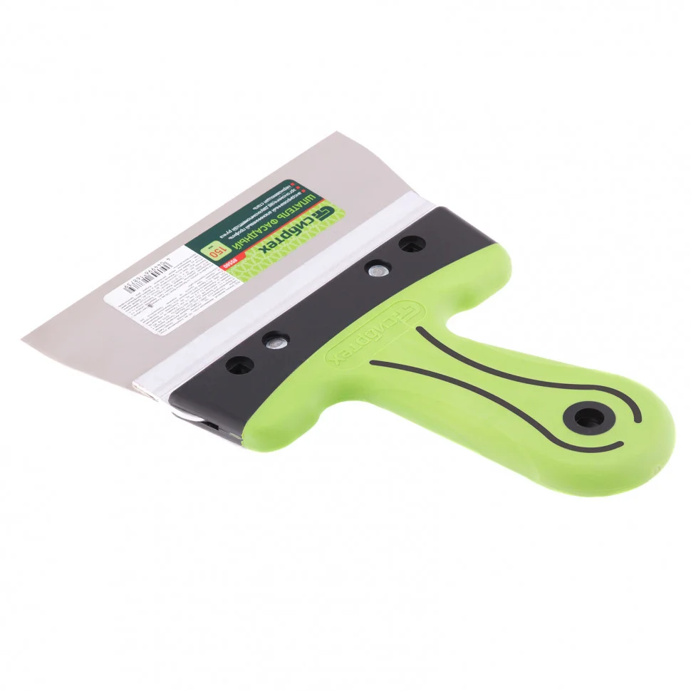 Фасадный шпатель Сибртех 85580 с рабочим полотном шириной 150 мм из нержавеющей стали и 2-компонентной рукояткой предназначен для нанесения, выравнивания и сглаживания отделочных составов, а также проведения других ремонтно-отделочных работ. Инструмент оптимально подходит для заглаживания зашпаклеванных швов.ПреимуществаДолговечность — рабочая часть из высококачественной нержавеющей стали и устойчива к износу и образованию коррозии.Надежность — алюминиевое ребро жесткости не допускает деформации рабочего полотна.Устойчивость к образованию коррозии — специальное защитное покрытие рабочей части позволяет увеличить срок службы инструмента.Универсальность — ширина 150 мм позволяет выполнять работы на больших и малых поверхностях.Максимально комфортная работа — двухкомпонентная изогнутая рукоятка эргономичной формы удобно ложится в руку и не проскальзывает в ладони.Простой уход — лезвие шпателя легко чистится после использования.Подвесное хранение — в рукоятке предусмотрено отверстие.