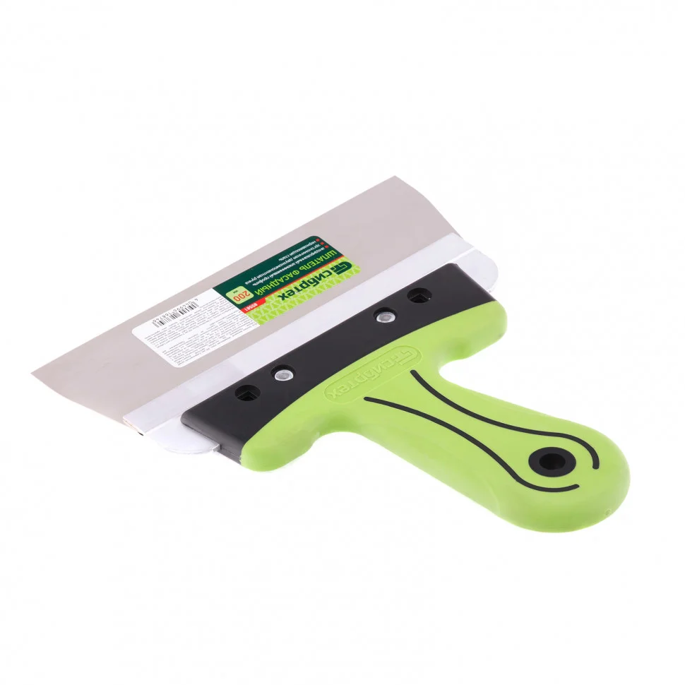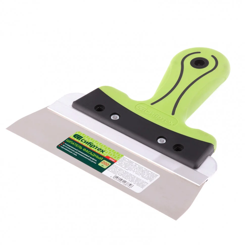 Фасадный шпатель Сибртех 85581 с рабочим полотном шириной 200 мм из нержавеющей стали и 2-компонентной рукояткой предназначен для нанесения, выравнивания и сглаживания отделочных составов, а также проведения других ремонтно-отделочных работ. Инструмент оптимально подходит для заглаживания зашпаклеванных швов.ПреимуществаДолговечность — рабочая часть из высококачественной нержавеющей стали и устойчива к износу и образованию коррозии.Надежность — алюминиевое ребро жесткости не допускает деформации рабочего полотна.Устойчивость к образованию коррозии — специальное защитное покрытие рабочей части позволяет увеличить срок службы инструмента.Универсальность — ширина 200 мм позволяет выполнять работы на больших и малых поверхностях.Максимально комфортная работа — двухкомпонентная изогнутая рукоятка эргономичной формы удобно ложится в руку и не проскальзывает в ладони.Простой уход — лезвие шпателя легко чистится после использования.Подвесное хранение — в рукоятке предусмотрено отверстие.