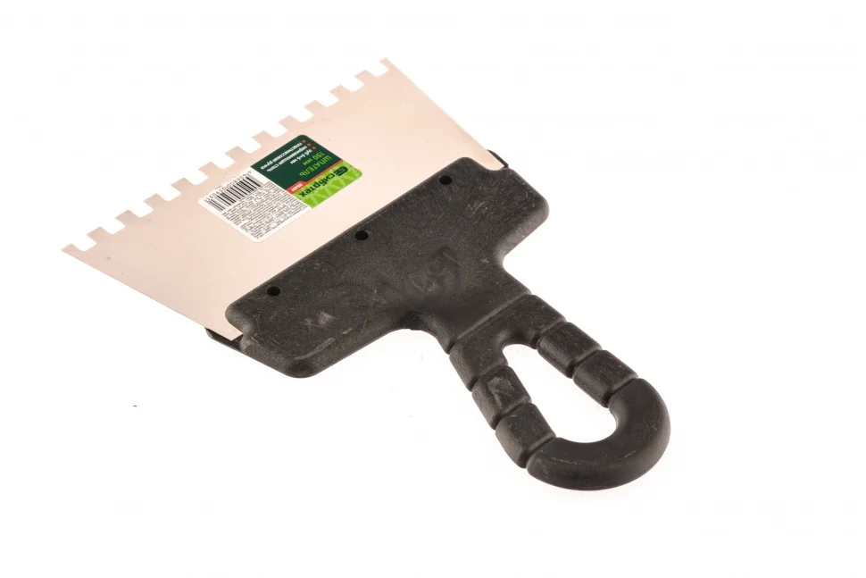 Шпатель Сибртех 85459 шириной 100 мм, из нержавеющей стали, с пластмассовой ручкой и зубьями 6 х 6 мм, применяется для равномерного нанесения клея при укладке мелкоформатной плитки, мозаики и т.д. Квадратные зубья облегчают нанесение клеевого состава, позволяя ровно и экономно распределять его по поверхности. Зубья размером 6 х 6 мм рассчитаны на плитку площадью 100-400 см2.ПреимуществаУпругое полотно — при изгибающих нагрузках шпатель быстро восстанавливает свою форму.Коррозионная стойкость — рабочее полотно выполнено из нержавеющей стали.Надежный хват — инструмент имеет эргономичную рельефную ручку.Удобство — рукоятка выполнена с небольшим наклоном для комфортного нанесения и выравнивания растворов.Практичное хранение — в рукоятке предусмотрено отверстие для подвешивания шпателя.
