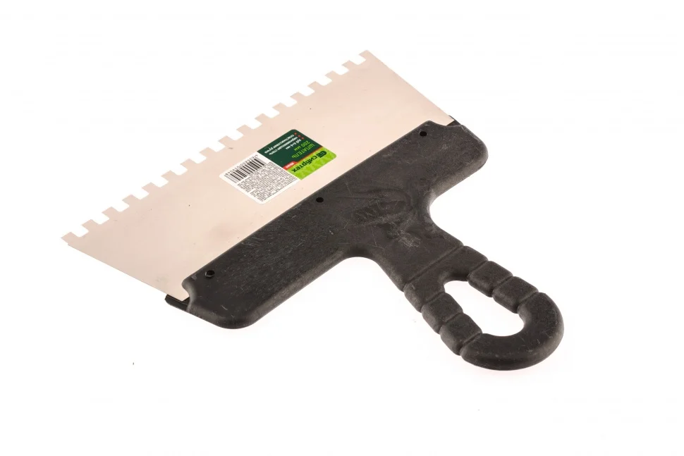 Шпатель Сибртех 85464 шириной 200 мм, из нержавеющей стали, с пластмассовой ручкой и зубьями 6 х 6 мм, применяется для равномерного нанесения клея при укладке мелкоформатной плитки, мозаики и т.д. Квадратные зубья облегчают нанесение клеевого состава, позволяя ровно и экономно распределять его по поверхности. Зубья размером 6 х 6 мм рассчитаны на плитку площадью 100-400 см2.ПреимуществаУпругое полотно — при изгибающих нагрузках шпатель быстро восстанавливает свою форму.Коррозионная стойкость — рабочее полотно выполнено из нержавеющей стали.Надежный хват — инструмент имеет эргономичную рельефную ручку.Удобство — рукоятка выполнена с небольшим наклоном для комфортного нанесения и выравнивания растворов.Практичное хранение — в рукоятке предусмотрено отверстие для подвешивания шпателя.