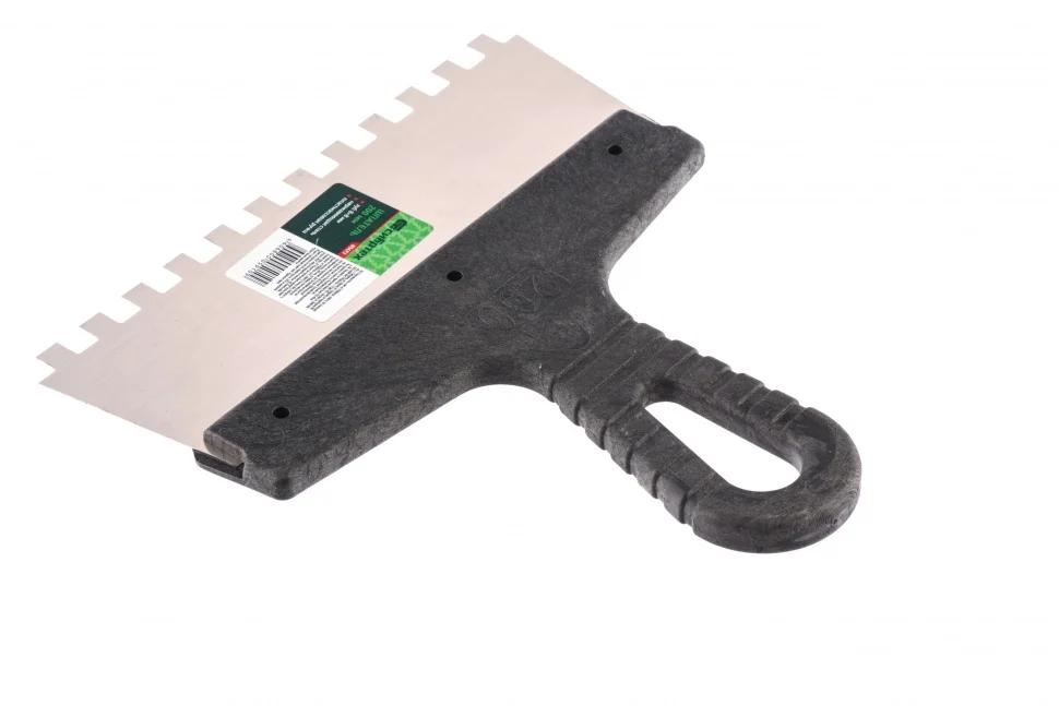 Шпатель Сибртех 85473 шириной 200 мм, из нержавеющей стали, с пластмассовой ручкой и зубьями 8 х 8 мм, применяется для равномерного нанесения клея при укладке мелкоформатной плитки, мозаики и т.д. Квадратные зубья облегчают нанесение клеевого состава, позволяя ровно и экономно распределять его по поверхности. Зубья размером 8 х 8 мм рассчитаны на плитку площадью 400-900 см2.ПреимуществаУпругое полотно — при изгибающих нагрузках шпатель быстро восстанавливает свою форму.Коррозионная стойкость — рабочее полотно выполнено из нержавеющей стали.Надежный хват — инструмент имеет эргономичную рельефную ручку.Удобство — рукоятка выполнена с небольшим наклоном для комфортного нанесения и выравнивания растворов.Практичное хранение — в рукоятке предусмотрено отверстие для подвешивания шпателя.
