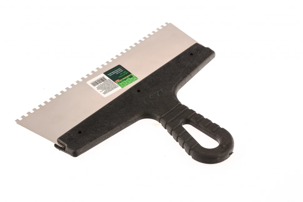 Шпатель Сибртех 85457 шириной 250 мм, из нержавеющей стали, с пластмассовой ручкой и зубьями 4 х 4 мм, применяется для равномерного нанесения клея при укладке мелкоформатной плитки, мозаики и т.д. Квадратные зубья облегчают нанесение клеевого состава, позволяя ровно и экономно распределять его по поверхности. Зубья размером 4 х 4 мм рассчитаны на плитку площадью 50-100 см2.ПреимуществаУпругое полотно — при изгибающих нагрузках шпатель быстро восстанавливает свою форму.Коррозионная стойкость — рабочее полотно выполнено из нержавеющей стали.Надежный хват — инструмент имеет эргономичную рельефную ручку.Удобство — рукоятка выполнена с небольшим наклоном для комфортного нанесения и выравнивания растворов.Практичное хранение — в рукоятке предусмотрено отверстие для подвешивания шпателя.