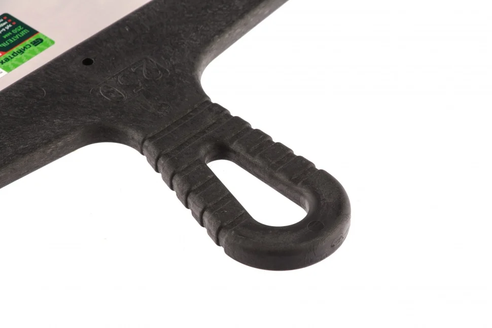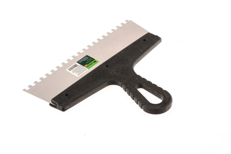 Шпатель Сибртех 85465 шириной 250 мм, из нержавеющей стали, с пластмассовой ручкой и зубьями 6 х 6 мм, применяется для равномерного нанесения клея при укладке мелкоформатной плитки, мозаики и т.д. Квадратные зубья облегчают нанесение клеевого состава, позволяя ровно и экономно распределять его по поверхности. Зубья размером 6 х 6 мм рассчитаны на плитку площадью 100-400 см2.ПреимуществаУпругое полотно — при изгибающих нагрузках шпатель быстро восстанавливает свою форму.Коррозионная стойкость — рабочее полотно выполнено из нержавеющей стали.Надежный хват — инструмент имеет эргономичную рельефную ручку.Удобство — рукоятка выполнена с небольшим наклоном для комфортного нанесения и выравнивания растворов.Практичное хранение — в рукоятке предусмотрено отверстие для подвешивания шпателя.
