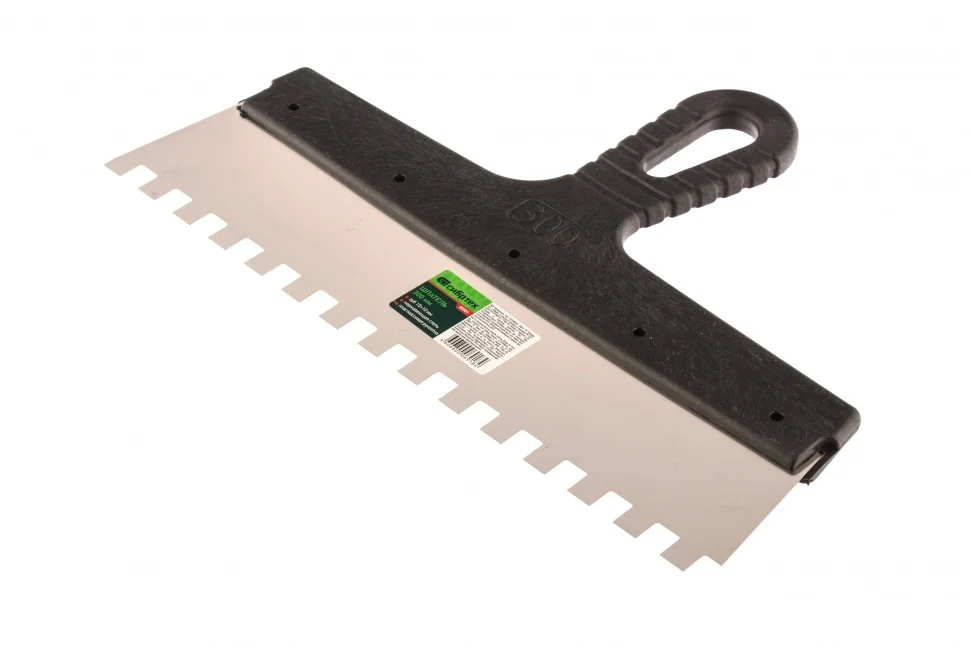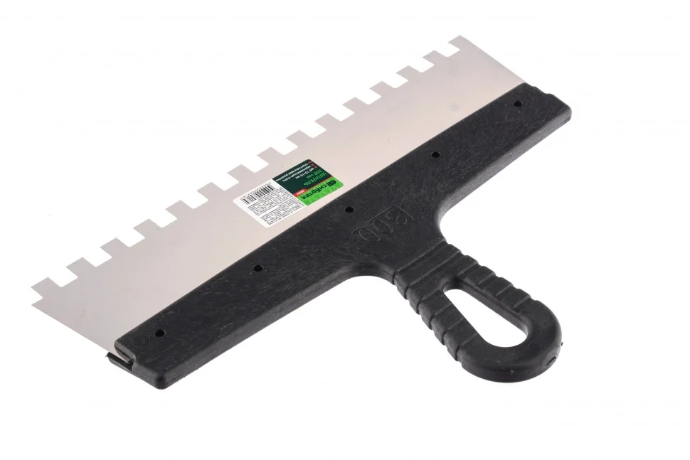Шпатель Sparta 85501 шириной 300 мм, из нержавеющей стали, с пластмассовой ручкой и зубьями 10 х 10 мм, применяется для равномерного нанесения клея при укладке мелкоформатной плитки, мозаики и т.д. Квадратные зубья облегчают нанесение клеевого состава, позволяя ровно и экономно распределять его по поверхности. Зубья размером 10 х 10 мм рассчитаны на плитку площадью 900-2500 см2.ПреимуществаУпругое полотно — при изгибающих нагрузках шпатель быстро восстанавливает свою форму.Коррозионная стойкость — рабочее полотно выполнено из нержавеющей стали.Надежный хват — инструмент имеет эргономичную рельефную ручку.Удобство — рукоятка выполнена с небольшим наклоном для комфортного нанесения и выравнивания растворов.Практичное хранение — в рукоятке предусмотрено отверстие для подвешивания шпателя.