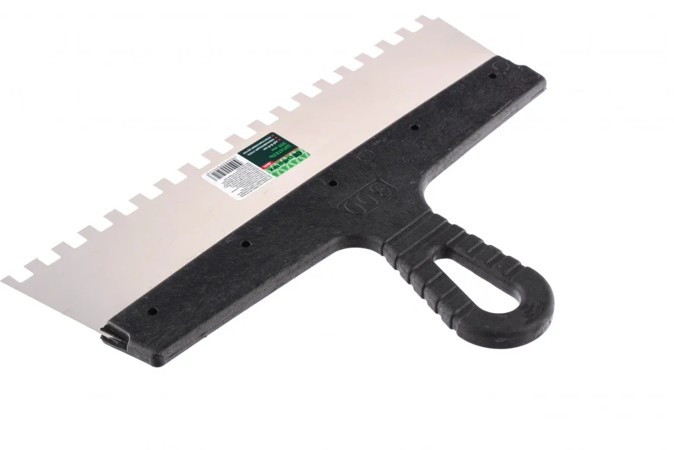 Шпатель Сибртех 85476 шириной 300 мм, из нержавеющей стали, с пластмассовой ручкой и зубьями 8 х 8 мм, применяется для равномерного нанесения клея при укладке мелкоформатной плитки, мозаики и т.д. Квадратные зубья облегчают нанесение клеевого состава, позволяя ровно и экономно распределять его по поверхности. Зубья размером 8 х 8 мм рассчитаны на плитку площадью 400-900 см2.ПреимуществаУпругое полотно — при изгибающих нагрузках шпатель быстро восстанавливает свою форму.Коррозионная стойкость — рабочее полотно выполнено из нержавеющей стали.Надежный хват — инструмент имеет эргономичную рельефную ручку.Удобство — рукоятка выполнена с небольшим наклоном для комфортного нанесения и выравнивания растворов.Практичное хранение — в рукоятке предусмотрено отверстие для подвешивания шпателя.