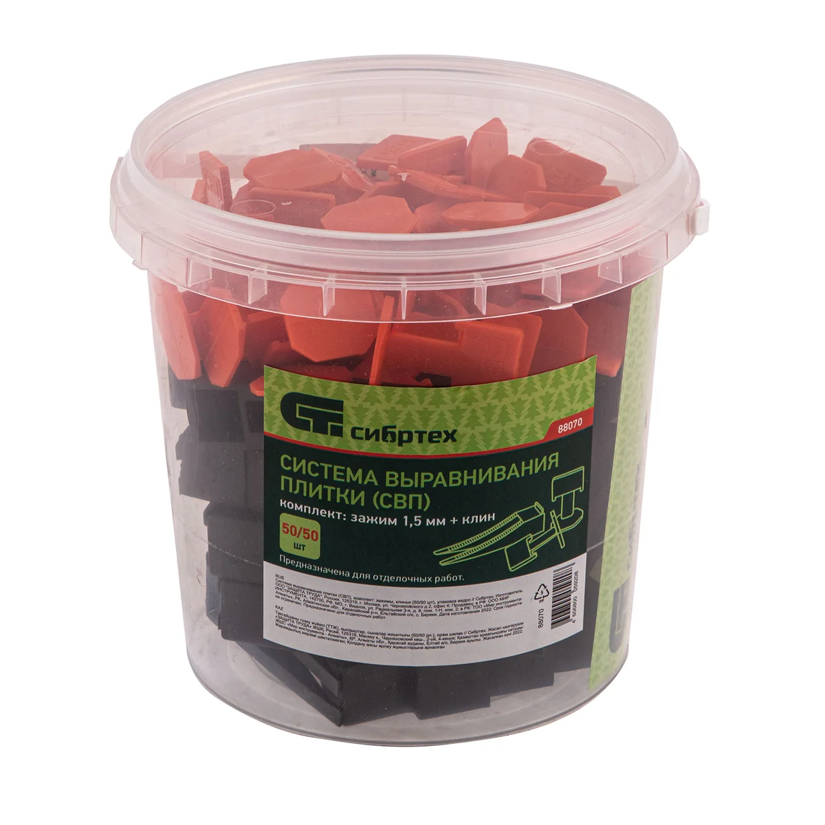 Система выравнивания плитки (СВП) Сибртех 88070 включает в комплект все необходимое: зажимы и клинья (50/50 шт., упаковка — ведро) для керамической и керамогранитной плитки толщиной 6-12 мм. Изделия предотвращают смещение плитки и гарантируют получение идеально ровных, аккуратных швов. Зажимы для плитки (СВП) предназначены для формирования швов 1,5-1,7 мм.