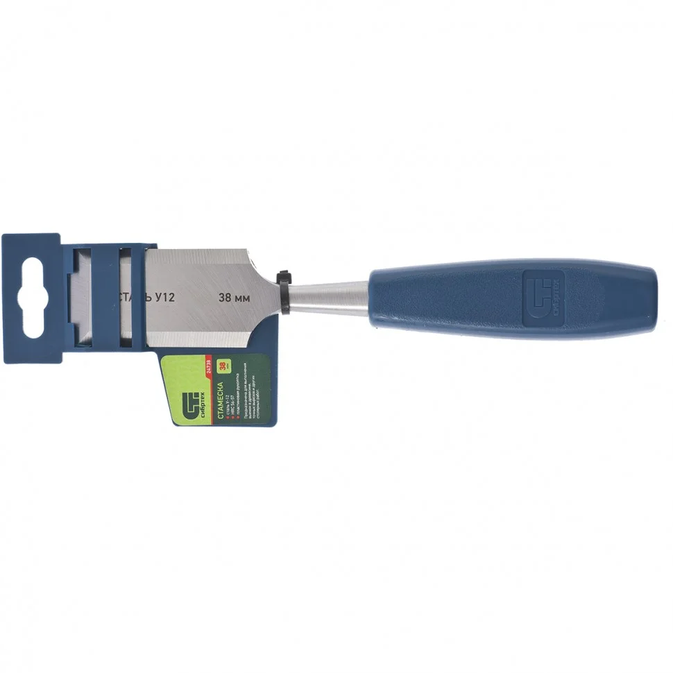 Стамеска Сибртех 24738 с пластиковой рукояткой и режущей частью шириной 38 мм подходит для обработки древесины любых пород. Предназначена для выборки небольших углублений, получения точных вырезов, снятия фасок и выполнения других столярно-плотницких работ. Инструмент будет полезен дома и в столярной мастерской.ПреимуществаПрочность и долговечность — рабочее полотно изготовлено из высококачественной конструкционной углеродистой стали 55.Эффективность и высокий ресурс — полотно закалено до твердости 56-57 HRC на 0,7 длины рабочей части, поэтому режущая кромка долго сохраняет остроту.Надежность и комфорт — ручка из ударопрочного пластика не выскальзывает из ладони и выдерживает длительное использование.