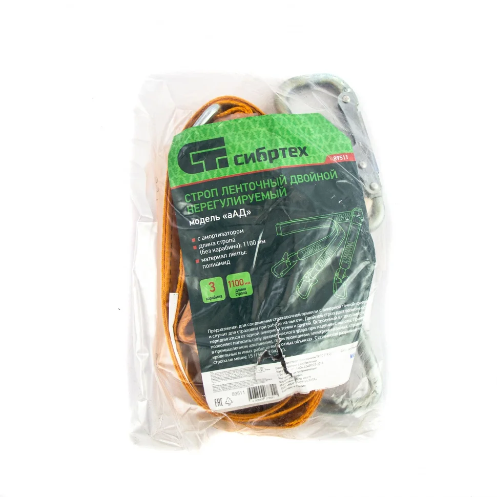 Ленточный двойной строп Сибртех 89511 с амортизатором, нерегулируемая модель «аАД», предназначен для соединения удерживающей (страховочной) привязи с анкерной точкой крепления. Используется совместно с удерживающими (страховочными) привязями, имеет 3 карабина, которые обеспечивают 3 точки крепления: 2 к анкерной точке и одну к поясу работника.ПреимуществаНадежность — карабины выполнены из высококачественной и долговечной стали.Прочность — строп из полиамидной ленты шириной 45 мм способен выдерживать статические нагрузки не менее 15 кН (1500 кгс).Встроенный амортизатор — при падении с высоты сила динамического удара гасится.Подтвержденное качество — изделие изготовлено в соответствии с требованиями ТР ТС 019/2011 «О безопасности средств индивидуальной защиты», гарантия на заводской брак действует 2 года.