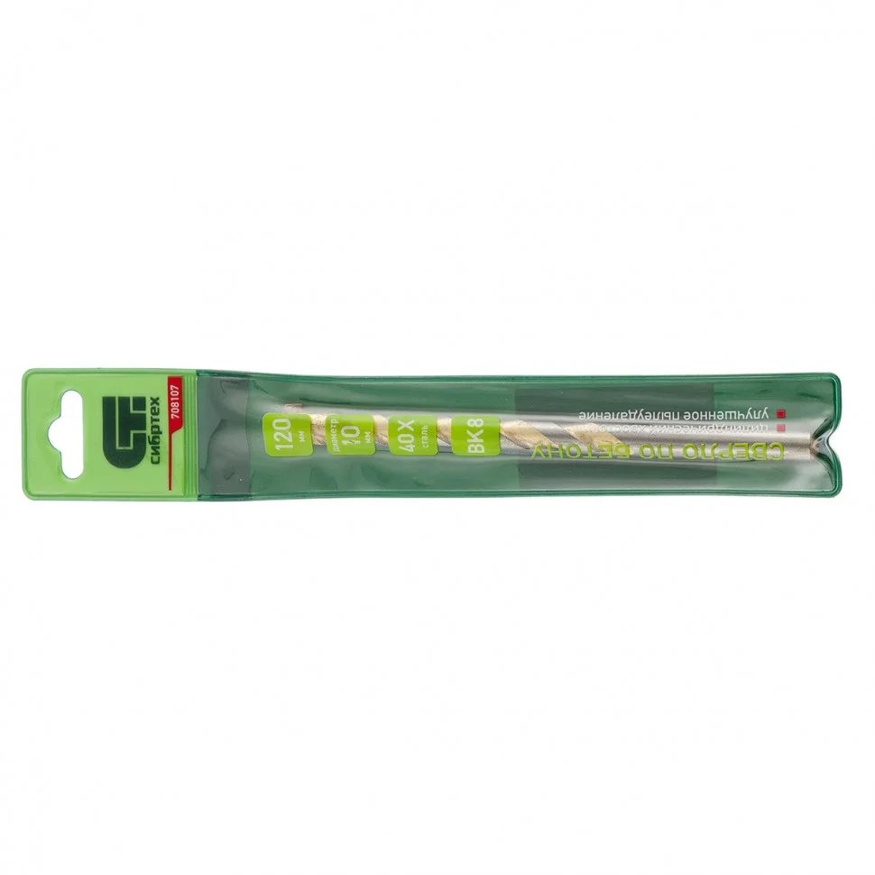 Сверло по бетону Сибртех 708107, 10 х 120 мм, с цилиндрическим хвостовиком и улучшенным пылеудалением, предназначено для сверления в ударном режиме бетона и кирпича. Изготовлено из стали 40Х, легированной хромом, поэтому устойчиво к динамическим нагрузкам. Сверло пригодится во время строительных и ремонтных работ.ПреимуществаРежущая пластина изготовлена из сплава карбида вольфрама твердостью 80-90 HRC, поэтому сверло эффективно для работы с твердыми материалами.Твердосплавная пластина остро заточена, что повышает производительность сверла.Специальная канавка способствует ускоренному отведению шлама, что обеспечивает защиту от перегрева и продлевает срок службы оснастки.