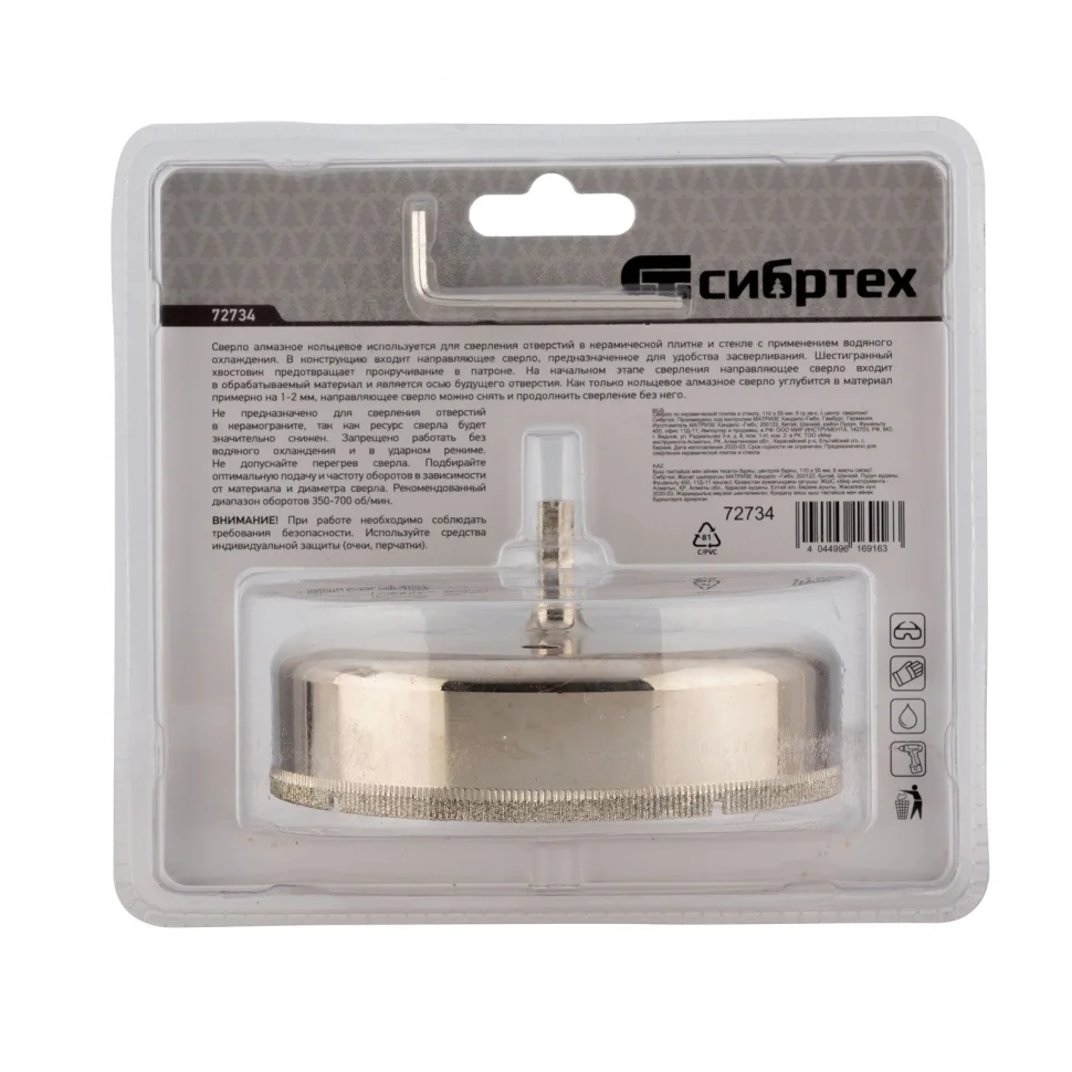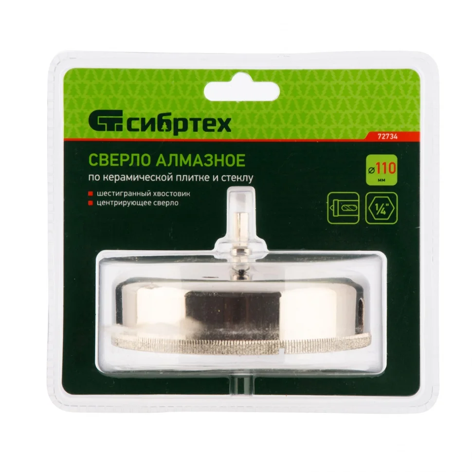 Сверло Сибртех 72734, 110 х 55 м, с 6-гранным хвостовиком и центрирующим сверлом позволяет сверлить отверстия в керамической плитке и стекле. Его устанавливают на дрель или шуруповерт, рекомендуемый диапазон рабочих оборотов 350-700 об/мин. Благодаря 6-гранному хвостовику сверло не проворачивается в патроне электроинструмента. После заглубления алмазной коронки на 1-2 мм рекомендуется снять центрирующее сверло, это поможет увеличить его ресурс. Применение водяного охлаждения значительно повышает срок службы оснастки. Ее используют при выполнении бытовых ремонтных и отделочных работ.ПреимуществаКоронка изготовлена из среднеуглеродистой стали марки 45, поэтому выдерживает повышенные механические нагрузки.Центрирующее сверло быстро заглубляется в материал, не давая коронке сдвигаться во время сверления.Центровик является съемным, при необходимости его можно заменить на сверло Сибртех 72709.Коррозионностойкое покрытие защищает оснастку от ржавчины при мокром сверлении, продлевая срок ее службы.