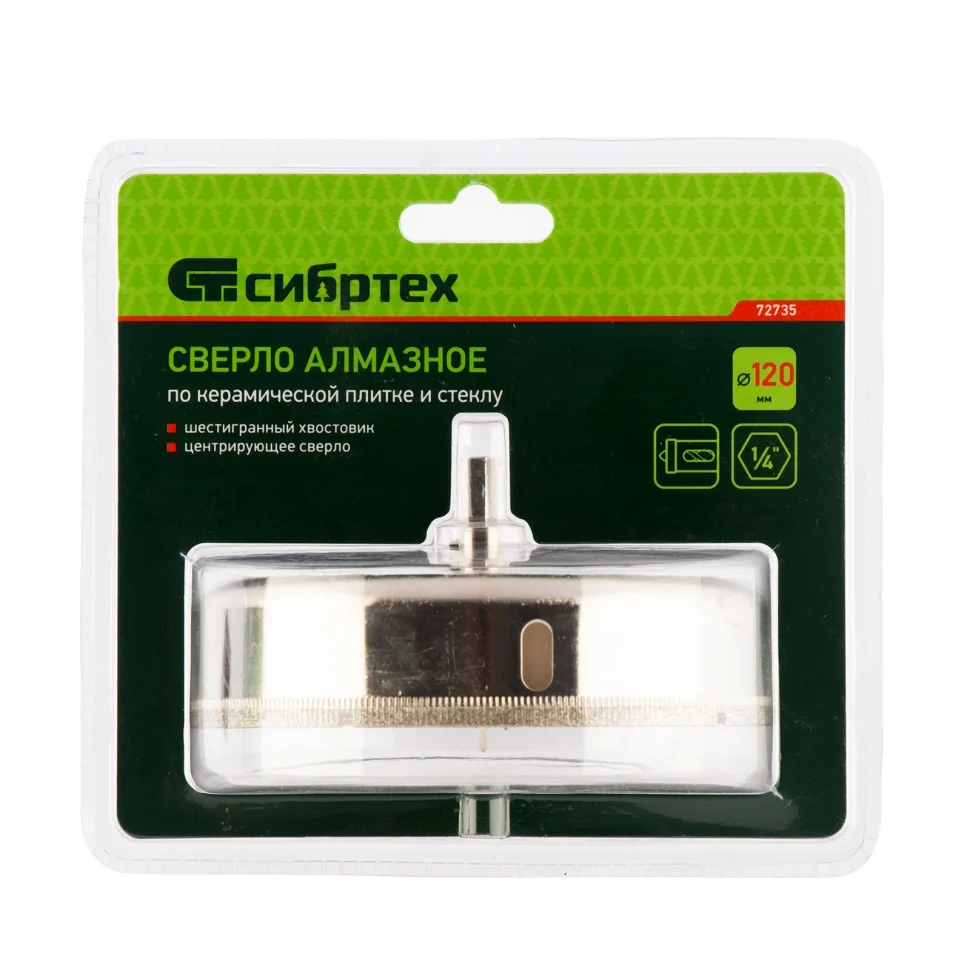 Сверло по керамической плитке и стеклу, 120 х 55 мм, шестигранный хвостовик, с центрующим сверлом Сибртех 72735