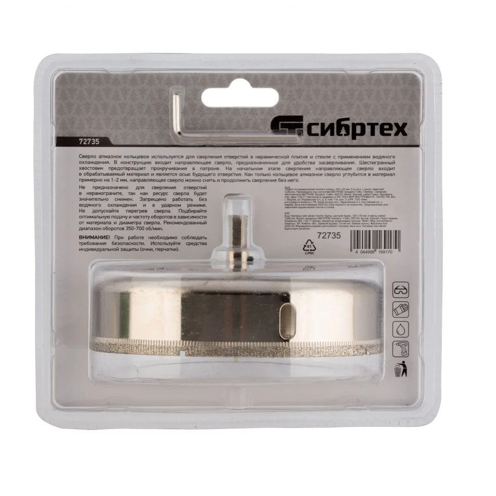 Сверло Сибртех 72735, 120 х 55 м, с 6-гранным хвостовиком и центрирующим сверлом позволяет сверлить отверстия в керамической плитке и стекле. Его устанавливают на дрель или шуруповерт, рекомендуемый диапазон рабочих оборотов 350-700 об/мин. Благодаря 6-гранному хвостовику сверло не проворачивается в патроне электроинструмента. После заглубления алмазной коронки на 1-2 мм рекомендуется снять центрирующее сверло, это поможет увеличить его ресурс. Применение водяного охлаждения значительно повышает срок службы оснастки. Ее используют при выполнении бытовых ремонтных и отделочных работ.ПреимуществаКоронка изготовлена из среднеуглеродистой стали марки 45, поэтому выдерживает повышенные механические нагрузки.Центрирующее сверло быстро заглубляется в материал, не давая коронке сдвигаться во время сверления.Центровик является съемным, при необходимости его можно заменить на сверло Сибртех 72709.Коррозионностойкое покрытие защищает оснастку от ржавчины при мокром сверлении, продлевая срок ее службы.