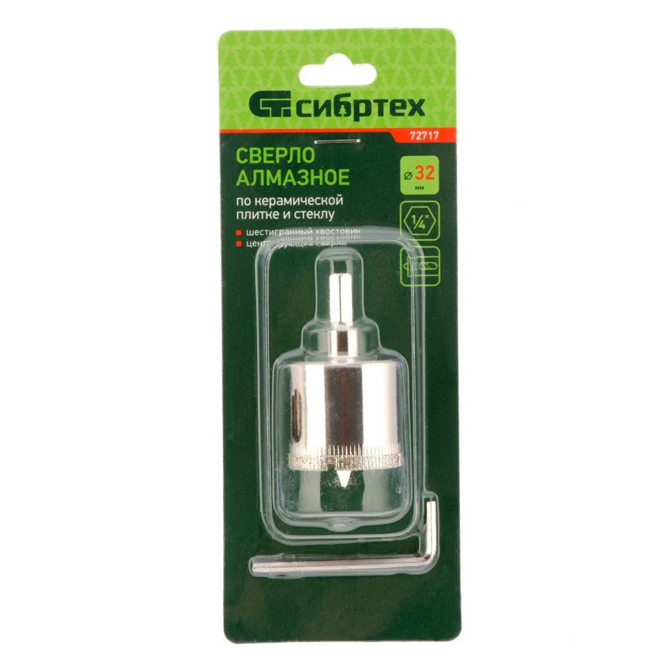 Сверло Сибртех 72717, 32 х 55 м, с 6-гранным хвостовиком и центрирующим сверлом позволяет сверлить отверстия в керамической плитке и стекле. Его устанавливают на дрель или шуруповерт, рекомендуемый диапазон рабочих оборотов 350-700 об/мин. Благодаря 6-гранному хвостовику сверло не проворачивается в патроне электроинструмента. После заглубления алмазной коронки на 1-2 мм рекомендуется снять центрирующее сверло, это поможет увеличить его ресурс. Применение водяного охлаждения значительно повышает срок службы оснастки. Ее используют при выполнении бытовых ремонтных и отделочных работ.ПреимуществаКоронка изготовлена из среднеуглеродистой стали марки 45, поэтому выдерживает повышенные механические нагрузки.Центрирующее сверло быстро заглубляется в материал, не давая коронке сдвигаться во время сверления.Центровик является съемным, при необходимости его можно заменить на сверло Сибртех 72709.Коррозионностойкое покрытие защищает оснастку от ржавчины при мокром сверлении, продлевая срок ее службы.
