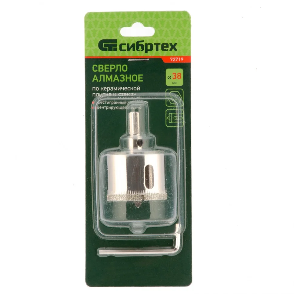 Сверло по керамической плитке и стеклу, 38 х 55 мм, шестигранный хвостовик, с центрующим сверлом Сибртех 72719
