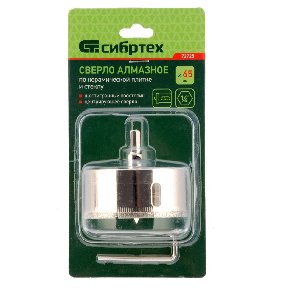 Сверло по керамической плитке и стеклу, 65 х 55 мм, шестигранный хвостовик, с центрующим сверлом Сибртех 72725