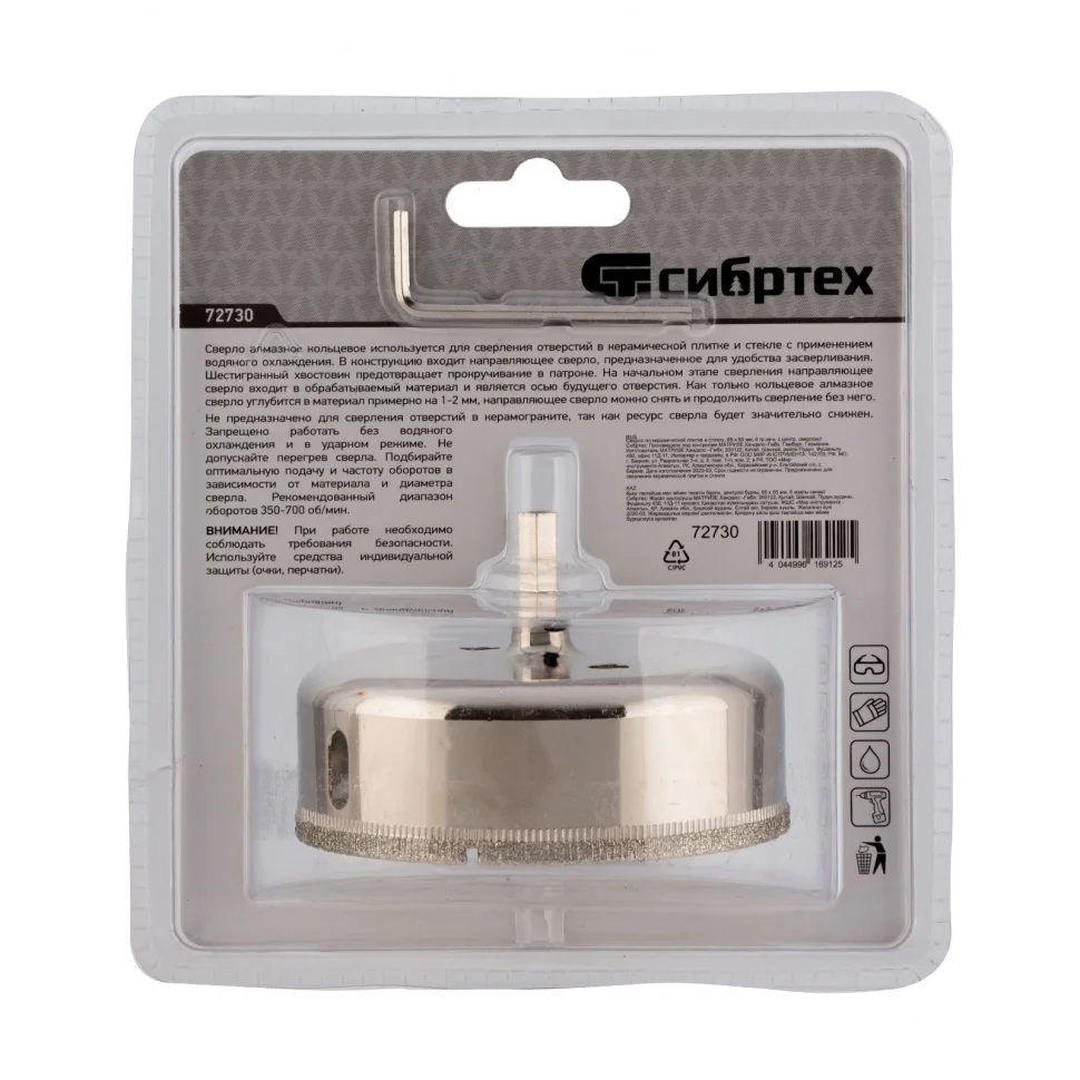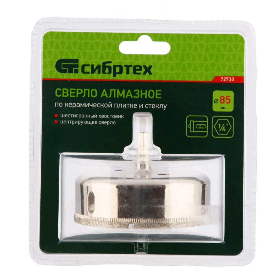 Сверло Сибртех 72730, 85 х 55 м, с 6-гранным хвостовиком и центрирующим сверлом позволяет сверлить отверстия в керамической плитке и стекле. Его устанавливают на дрель или шуруповерт, рекомендуемый диапазон рабочих оборотов 350-700 об/мин. Благодаря 6-гранному хвостовику сверло не проворачивается в патроне электроинструмента. После заглубления алмазной коронки на 1-2 мм рекомендуется снять центрирующее сверло, это поможет увеличить его ресурс. Применение водяного охлаждения значительно повышает срок службы оснастки. Ее используют при выполнении бытовых ремонтных и отделочных работ.ПреимуществаКоронка изготовлена из среднеуглеродистой стали марки 45, поэтому выдерживает повышенные механические нагрузки.Центрирующее сверло быстро заглубляется в материал, не давая коронке сдвигаться во время сверления.Центровик является съемным, при необходимости его можно заменить на сверло Сибртех 72709.Коррозионностойкое покрытие защищает оснастку от ржавчины при мокром сверлении, продлевая срок ее службы.