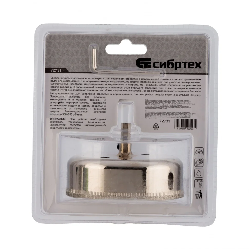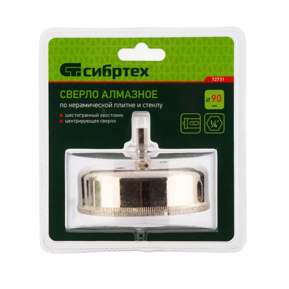 Сверло Сибртех 72731, 90 х 55 м, с 6-гранным хвостовиком и центрирующим сверлом позволяет сверлить отверстия в керамической плитке и стекле. Его устанавливают на дрель или шуруповерт, рекомендуемый диапазон рабочих оборотов 350-700 об/мин. Благодаря 6-гранному хвостовику сверло не проворачивается в патроне электроинструмента. После заглубления алмазной коронки на 1-2 мм рекомендуется снять центрирующее сверло, это поможет увеличить его ресурс. Применение водяного охлаждения значительно повышает срок службы оснастки. Ее используют при выполнении бытовых ремонтных и отделочных работ.ПреимуществаКоронка изготовлена из среднеуглеродистой стали марки 45, поэтому выдерживает повышенные механические нагрузки.Центрирующее сверло быстро заглубляется в материал, не давая коронке сдвигаться во время сверления.Центровик является съемным, при необходимости его можно заменить на сверло Сибртех 72709.Коррозионностойкое покрытие защищает оснастку от ржавчины при мокром сверлении, продлевая срок ее службы.