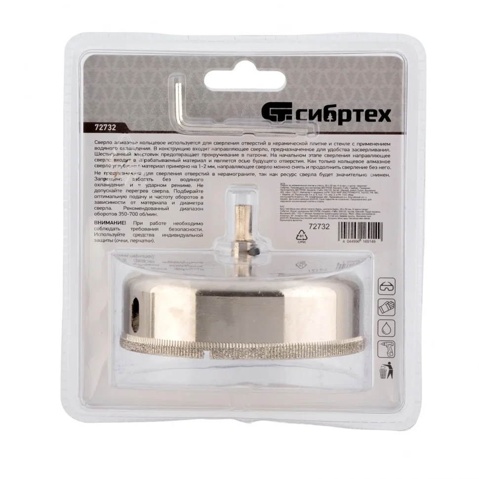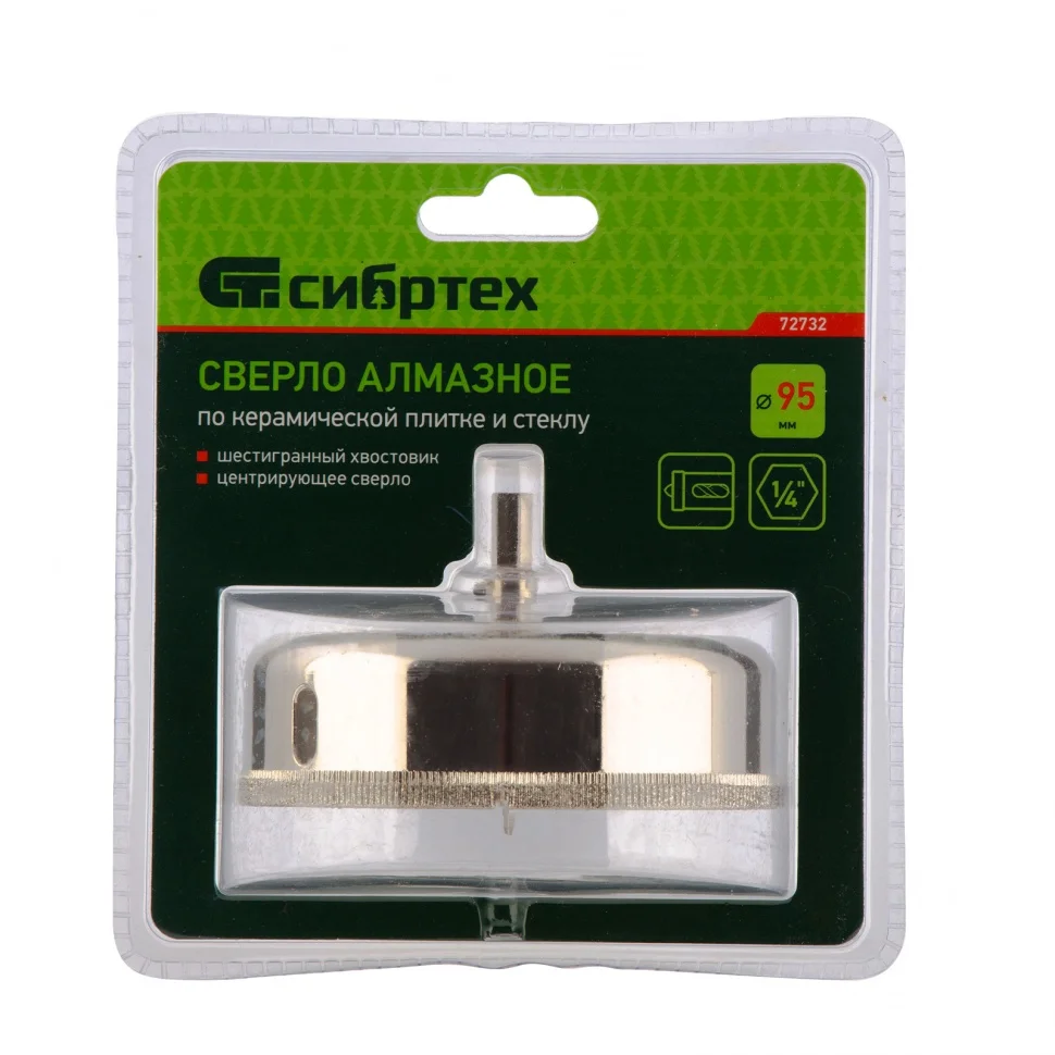 Сверло Сибртех 72732, 95 х 55 м, с 6-гранным хвостовиком и центрирующим сверлом позволяет сверлить отверстия в керамической плитке и стекле. Его устанавливают на дрель или шуруповерт, рекомендуемый диапазон рабочих оборотов 350-700 об/мин. Благодаря 6-гранному хвостовику сверло не проворачивается в патроне электроинструмента. После заглубления алмазной коронки на 1-2 мм рекомендуется снять центрирующее сверло, это поможет увеличить его ресурс. Применение водяного охлаждения значительно повышает срок службы оснастки. Ее используют при выполнении бытовых ремонтных и отделочных работ.ПреимуществаКоронка изготовлена из среднеуглеродистой стали марки 45, поэтому выдерживает повышенные механические нагрузки.Центрирующее сверло быстро заглубляется в материал, не давая коронке сдвигаться во время сверления.Центровик является съемным, при необходимости его можно заменить на сверло Сибртех 72709.Коррозионностойкое покрытие защищает оснастку от ржавчины при мокром сверлении, продлевая срок ее службы.