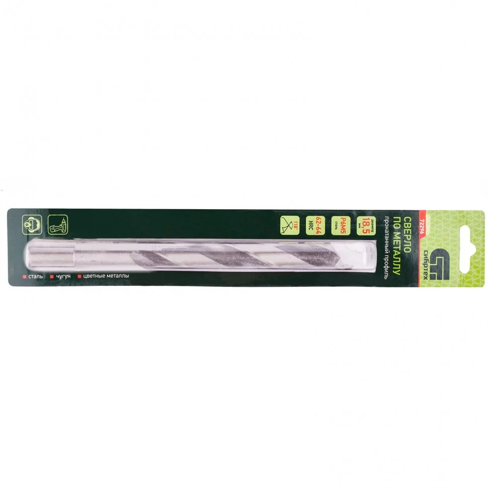 Сверло по металлу Сибртех 72296 из стали P6M5 имеет угол заточки 118 градусов и позволяет получать отверстия диаметром 18,5 мм в черных и тяжелых металлах, в том числе стали, чугуне и твердой бронзе. Сверло отличается наиболее выгодной стоимостью по сравнению с другими моделями из стали P6M5. Используется для монтажно-сборочных работ, будет полезно в быту.ПреимуществаСверло изготовлено из быстрорежущей стали, легированной вольфрамом и молибденом, поэтому устойчиво к динамическим нагрузкам и перегреву.Режущие кромки имеют твердость 62-64 HRC, поэтому долго держат заточку.Благодаря полированной поверхности уменьшается трение сверла о стенки отверстия и улучшается отведение стружки.Цилиндрический хвостовик проточен, что повышает надежность его фиксации в патроне.