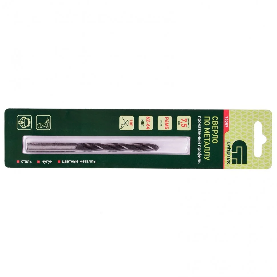Сверло по металлу Сибртех 72257 из стали P6M5 имеет угол заточки 118 градусов и позволяет получать отверстия диаметром 7,5 мм в черных и тяжелых металлах, в том числе стали, чугуне и твердой бронзе. Сверло отличается наиболее выгодной стоимостью по сравнению с другими моделями из стали P6M5. Используется для монтажно-сборочных работ, будет полезно в быту.ПреимуществаСверло изготовлено из быстрорежущей стали, легированной вольфрамом и молибденом, поэтому устойчиво к динамическим нагрузкам и перегреву.Режущие кромки имеют твердость 62-64 HRC, поэтому долго держат заточку.Благодаря полированной поверхности уменьшается трение сверла о стенки отверстия и улучшается отведение стружки.Цилиндрический хвостовик подходит к патронам любого типа.