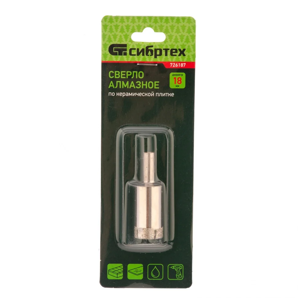 Сверло Сибртех 726187, 18 х 55 мм, с цилиндрическим хвостовиком, используется для получения ровных отверстий без сколов в стекле и керамической плитке. Устанавливается в патрон дрели или шуруповерта, работающих в диапазоне 350-700 об/мин. Во время работы рекомендуется применять водяное охлаждение — это существенно увеличит ресурс оснастки. Использование кондуктора Matrix 72830 позволяет точно позиционировать сверло и облегчает засверливание. Оснастка подходит для выполнения работ небольшого объема и рекомендована для использования в быту.ПреимуществаСверло изготовлено из среднеуглеродистой стали 45, поэтому характеризуется прочностью и долговечностью.Рабочая часть с алмазным напылением обеспечивает быстрый и ровный рез.На поверхность сверла нанесено покрытие для защиты от коррозии, что в значительной степени продлевает срок его службы.