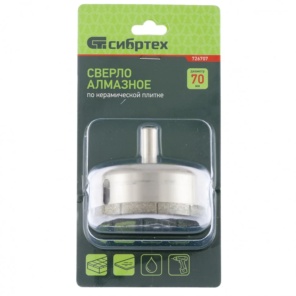 Сверло Сибртех 726707, 70 х 55 мм, с цилиндрическим хвостовиком, используется для получения ровных отверстий без сколов в стекле и керамической плитке. Устанавливается в патрон дрели или шуруповерта, работающих в диапазоне 350-700 об/мин. Во время работы рекомендуется применять водяное охлаждение — это существенно увеличит ресурс оснастки. Использование кондуктора Matrix 72830 позволяет точно позиционировать сверло и облегчает засверливание. Оснастка подходит для выполнения работ небольшого объема и рекомендована для использования в быту.ПреимуществаСверло изготовлено из среднеуглеродистой стали 45, поэтому характеризуется прочностью и долговечностью.Рабочая часть с алмазным напылением обеспечивает быстрый и ровный рез.На поверхность сверла нанесено покрытие для защиты от коррозии, что в значительной степени продлевает срок его службы.