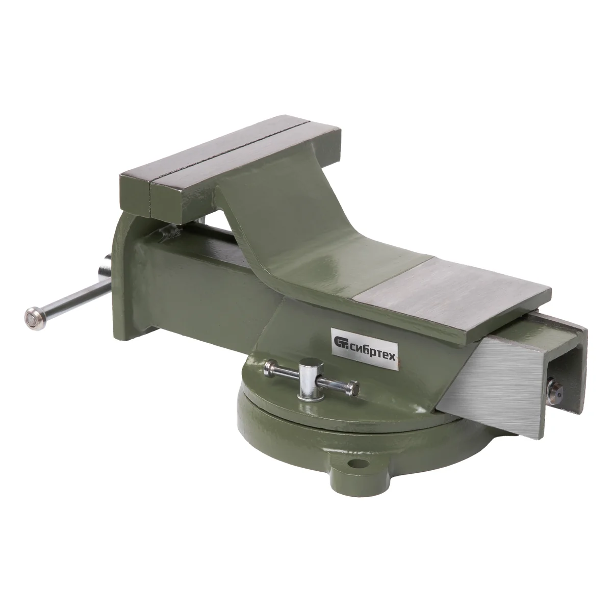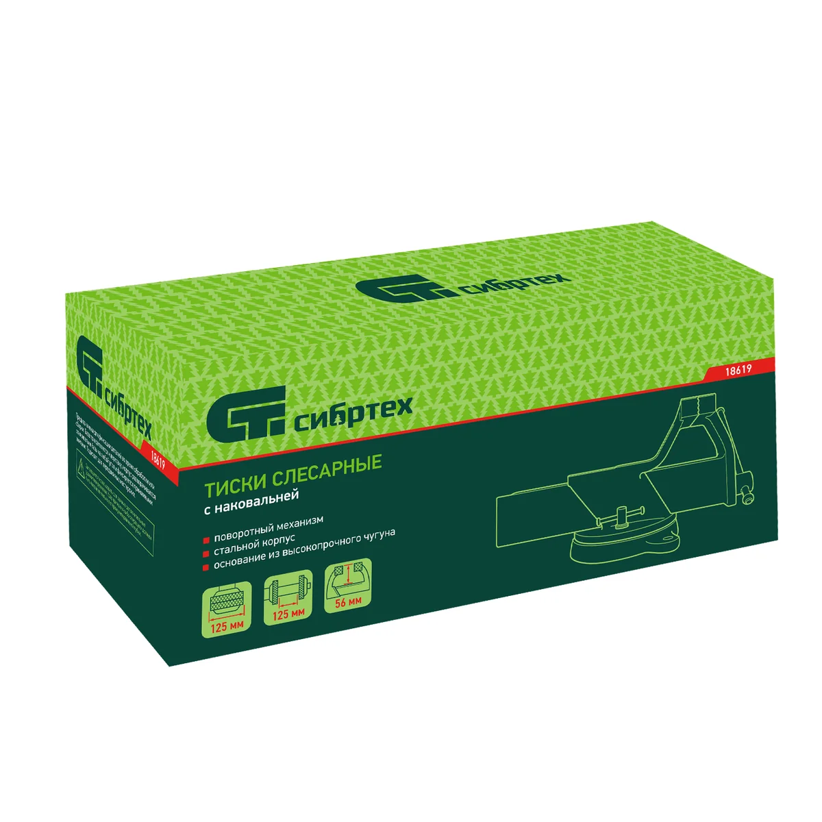 Стальные слесарные тиски Сибртех 18619 с поворотным механизмом и прижимными винтами имеют ширину губок 125 мм и предназначены для жесткой фиксации деталей. Используются для сверления, шлифования, пиления, выполнения сборочных и других работ. Тиски вращаются на 360°, что позволяет придать заготовке оптимальное положение. Приспособление будет полезно в мастерской, на даче и в гараже.ПреимуществаЛегкая и надежная конструкция — тиски изготовлены из прочной стали и рассчитаны на длительное использование.Простая установка — в основании имеются отверстия для крепления к верстаку.Дополнительные возможности — на корпусе есть наковальня для выравнивания заготовок при помощи молотка.Надежная фиксация — губки с рельефной поверхностью не скользят по поверхности детали.Аккуратная работа — чтобы избежать повреждения заготовок, на губки можно установить защитные накладки (приобретаются отдельно).