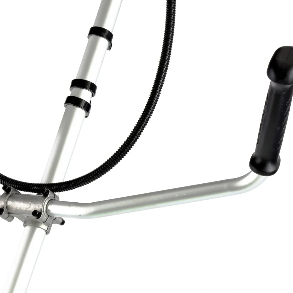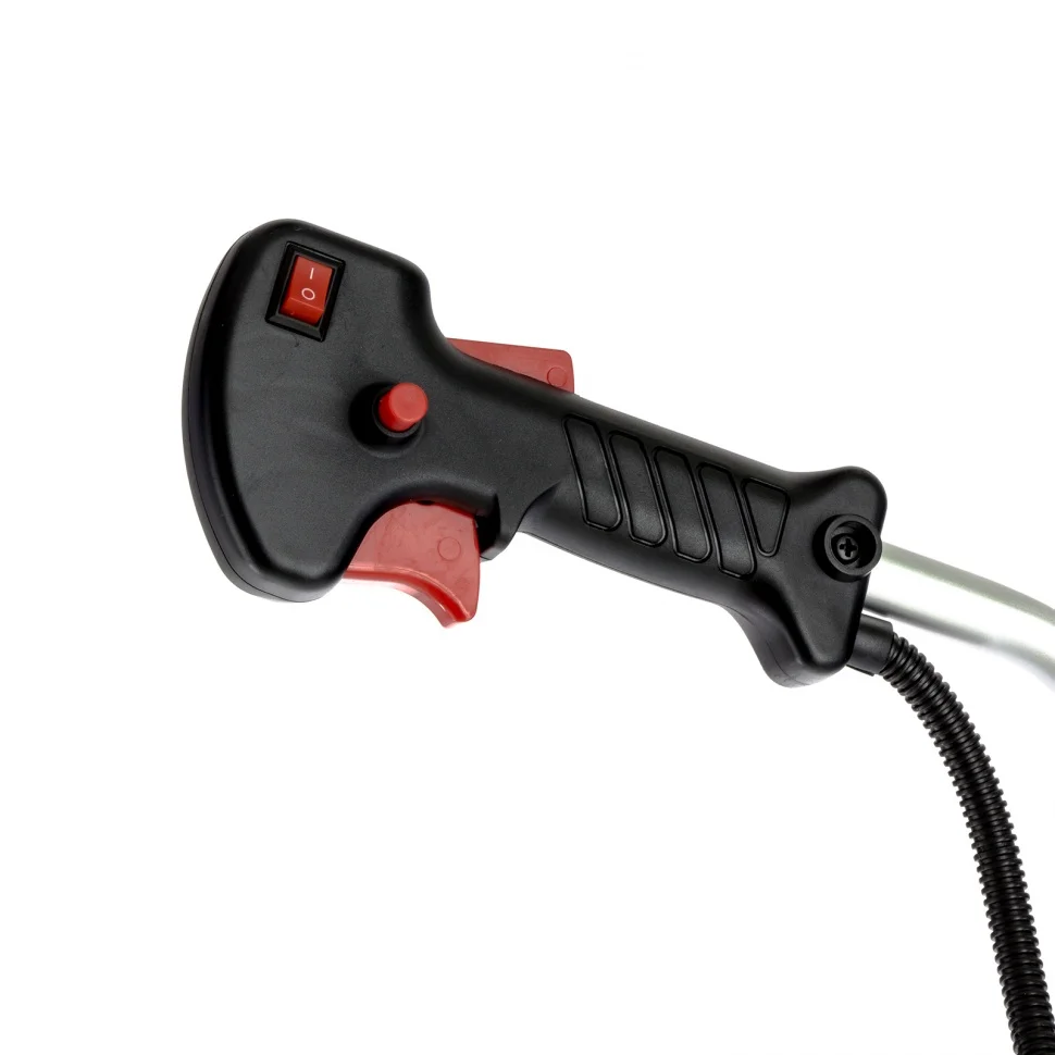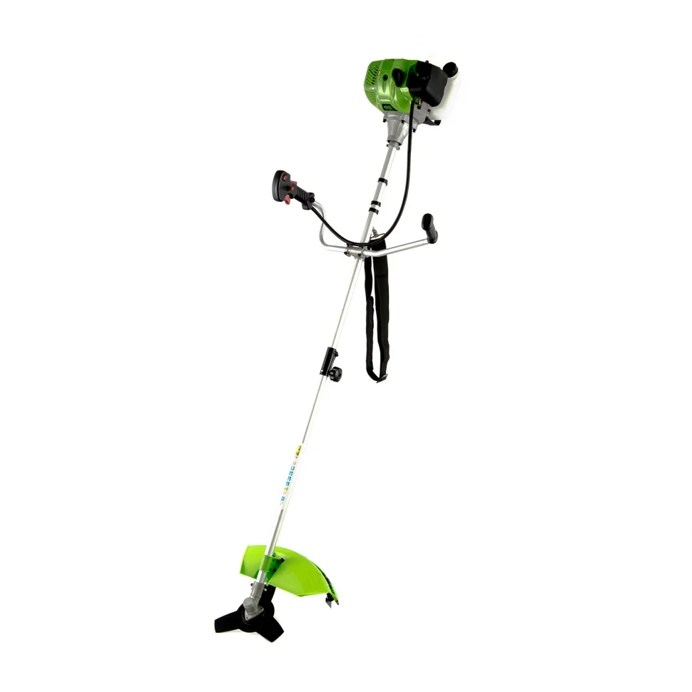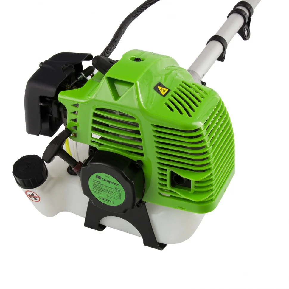 Бензиновый триммер Сибртех БКС-2500-2 96244 с разъемной штангой из 2 частей, с двигателем объемом 43 куб. см и мощностью 2,5 л. с., предназначен для бытового и сельскохозяйственного использования. С его помощью легко можно подстричь газон, избавиться от сорняков и бурьяна или заготовить сено. В комплекте леска и трехлопастный нож, поэтому триммер подходит как для ухода за дачным участком, так и для облагораживания запущенных территорий. Мощный бензиновый двигатель обеспечивает высокую скорость вращения шпинделя 9500 об/мин, что позволяет эффективно справляться даже с густыми зарослями. Ширина скашивания леской составляет 42 см, ножом — 25,5 см, что позволяет быстро обрабатывать участки большой площади.ПреимуществаДолговечность — хонингованный и хромированный цилиндр двигателя, усиленное сцепление и карбюратор высокой точности сборки обеспечивают длительную стабильную работу триммера.Безопасность пользователя — прочно закрепленный кожух надежно защищает от летящей травы и веток.Экономичность — расход топлива составляет 1,2 л/ч, а значит, полного бака объемом 0,85 л хватит на 40 минут работы.Контроль уровня топлива — благодаря прозрачным стенкам бака можно легко отслеживать количество топливной смеси в нем.Легкий старт — усиленный стартер и праймер (ручная подкачка топлива) обеспечивают быстрый запуск даже после долгого простоя.Быстрая подача лески — для выпуска корда достаточно слегка ударить катушкой по земле, останавливать двигатель для этого не требуется.Удобное управление — благодаря фиксатору не нужно постоянно удерживать клавишу газа, а выключатель зажигания позволяет быстро остановить двигатель при необходимости.Простое обслуживание — крышка воздушного фильтра с винтовым креплением легко снимается без специальных инструментов.Антивибрационная система — благодаря эффективному поглощению колебаний даже длительная работа не вызывает дискомфорт.Комфортная работа — благодаря ручкам велосипедного типа триммер легко удерживать и направлять, а плечевой ремень снижает нагрузку на спину.Удобная транспортировка и хранение — благодаря разборной штанге триммер не занимает много места.