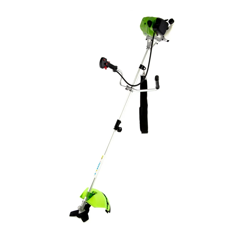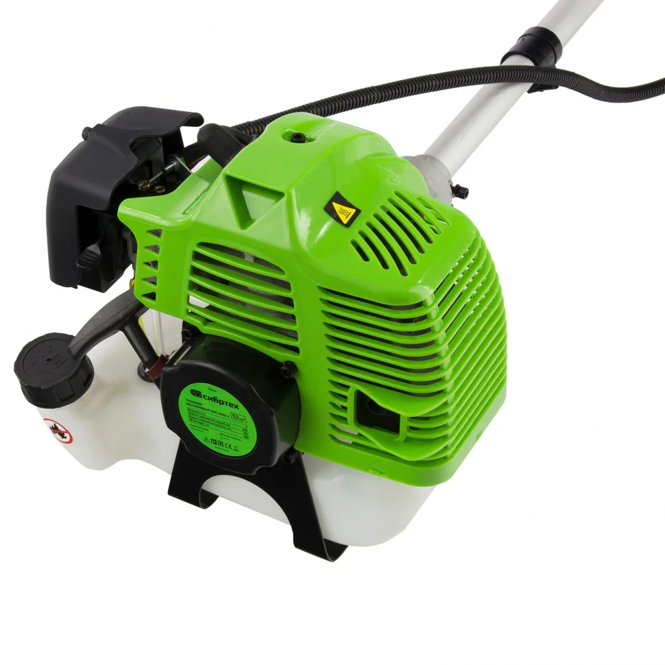 Бензиновый триммер Сибртех БКС-3000-2 96246 с разъемной штангой из 2 частей, оснащенный двигателем объемом 52 куб. см и мощностью 3 л. с., предназначен для срезания высокой травы, выравнивания газонов, прореживания бурьяна, удаления сорняков. Также его можно использовать для заготовки сена или для ухода за придомовой территорией. Частота вращения шпинделя составляет 9500 об/мин, что обеспечивает высокую производительность триммера. В комплект входит усиленная полуавтоматическая катушка из полипропилена и трехлопастный нож. Катушкой с леской можно выравнивать газон, подрезать кустарники, создавать ландшафт. Нож поможет избавиться от жесткой травы и сорняков. За один проход леска делает срез шириной 42 см, а нож — 25,5 см, поэтому обработка участка не займет много времени.ПреимуществаДолговечность — хонингованный и хромированный цилиндр двигателя, усиленное сцепление и карбюратор высокой точности сборки обеспечивают длительную стабильную работу триммера.Безопасность пользователя — прочно закрепленный кожух надежно защищает от летящей травы и веток.Экономичность — расход топлива составляет 1,2 л/ч, а значит, полного бака объемом 0,85 л хватит на 40 минут работы.Контроль уровня топлива — благодаря прозрачным стенкам бака можно легко отслеживать количество топливной смеси в нем.Легкий старт — усиленный стартер и праймер (ручная подкачка топлива) обеспечивают быстрый запуск даже после долгого простоя.Быстрая подача лески — для выпуска корда достаточно слегка ударить катушкой по земле, останавливать двигатель для этого не требуется.Удобное управление — благодаря фиксатору не нужно постоянно удерживать клавишу газа, а выключатель зажигания позволяет быстро остановить двигатель при необходимости.Простое обслуживание — крышка воздушного фильтра с винтовым креплением легко снимается без специальных инструментов.Антивибрационная система — благодаря эффективному поглощению колебаний даже длительная работа не вызывает дискомфорт.Комфортная работа — благодаря ручкам велосипедного типа триммер легко удерживать и направлять, а плечевой ремень снижает нагрузку на спину.Удобная транспортировка и хранение — благодаря разборной штанге триммер не занимает много места.