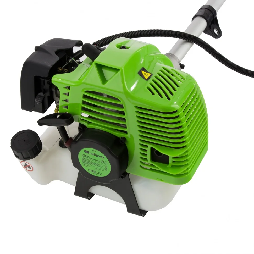 Бензиновый триммер Сибртех БКС-3000 96245 с мощным двигателем на 3 л. с. объемом 52 куб. см, с неразъемной штангой, поставляется комплектом из 2 частей и пригодится не только для облагораживания дачного участка, но и для заготовки сена в сельской местности или ухода за придомовыми территориями. В качестве режущего элемента используется катушка с леской и трехлопастный нож. С помощью лески можно выравнивать газон и формировать ландшафт. А нож поможет обработать запущенный участок — срезать бурьян, жесткую и высокую траву. Триммер эффективно справляется с густой травой, ширина скашивания леской составляет 42 см, ножом — 25,5 см, а значит, можно быстро обработать участок большой площади.ПреимуществаДолговечность — хонингованный и хромированный цилиндр двигателя, усиленное сцепление и карбюратор высокой точности сборки обеспечивают длительную стабильную работу триммера.Безопасность пользователя — прочно закрепленный кожух надежно защищает от летящей травы и веток.Экономичность — расход топлива составляет 1,2 л/ч, а значит, полного бака объемом 0,85 л хватит на 40 минут работы.Контроль уровня топлива — благодаря прозрачным стенкам бака можно легко отслеживать количество топливной смеси в нем.Легкий старт — усиленный стартер и праймер (ручная подкачка топлива) обеспечивают быстрый запуск даже после долгого простоя.Быстрая подача лески — для выпуска корда достаточно слегка ударить катушкой по земле, останавливать двигатель для этого не требуется.Удобное управление — благодаря фиксатору не нужно постоянно удерживать клавишу газа, а выключатель зажигания позволяет быстро остановить двигатель при необходимости.Простое обслуживание — крышка воздушного фильтра с винтовым креплением легко снимается без специальных инструментов.Антивибрационная система — благодаря эффективному поглощению колебаний даже длительная работа не вызывает дискомфорт.Комфортная работа — благодаря ручкам велосипедного типа триммер легко удерживать и направлять, а плечевой ремень снижает нагрузку на спину.