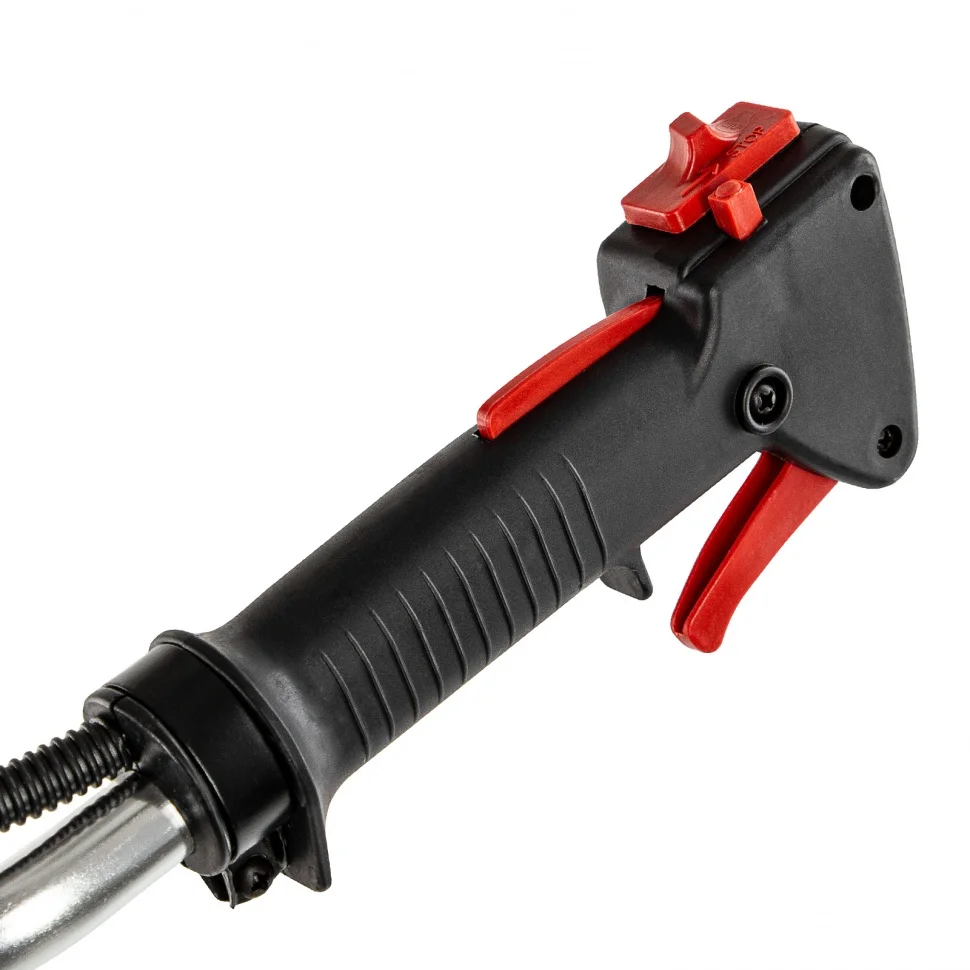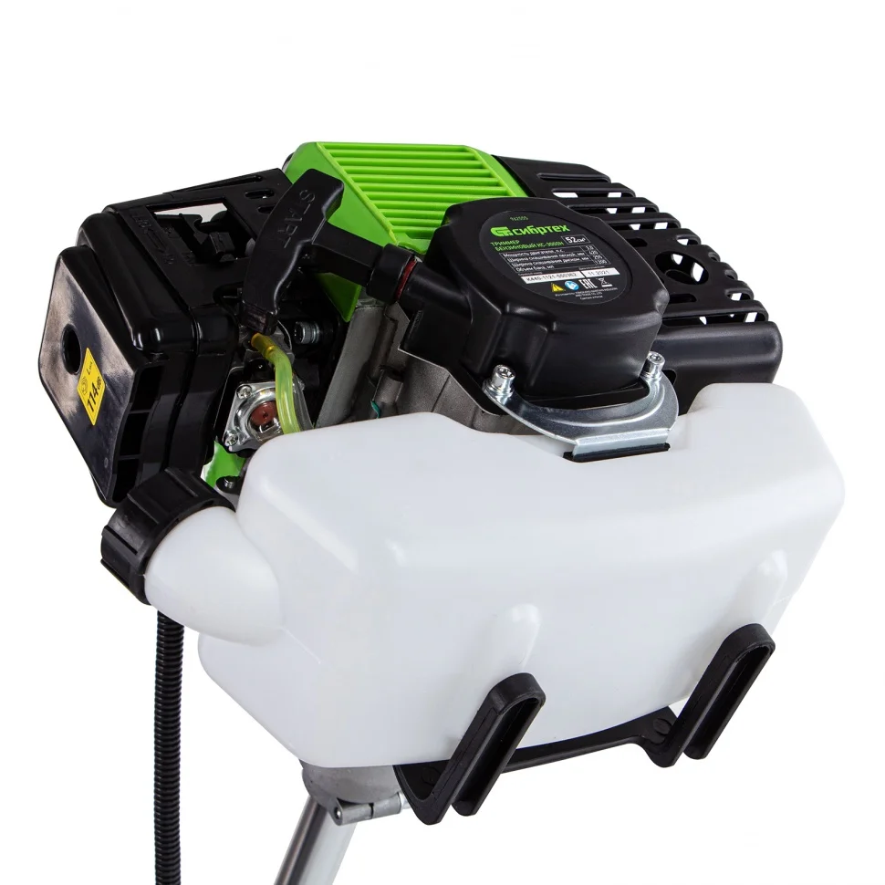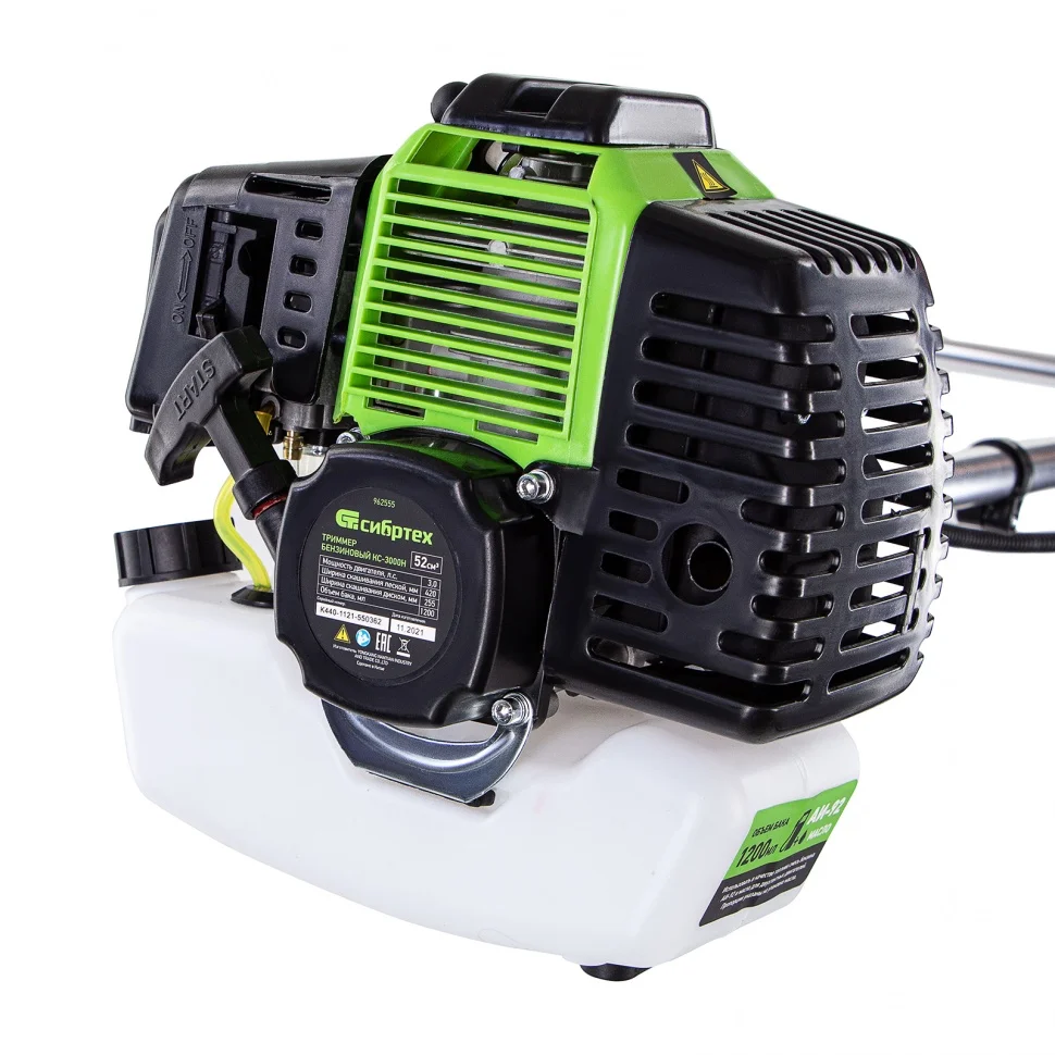 Бензиновый триммер Сибртех КС-3000Н 962555 с неразъемной штангой имеет двигатель увеличенного объема 52 куб. см, поставляется 2 частями и предназначен для ухода за дачным участком. Используется для стрижки и скашивания травы, обработки границ газонов и борьбы с сорняками. Для эффективного решения этих задач предусмотрены катушка с леской и трехлопастный нож, легко срезающий густую траву и толстые стебли. Ширина скашивания леской составляет 42 см, ножом — 25,5 см, что в сочетании с мощностью двигателя 3 л. с. обеспечивает высокую производительность триммера.ПреимуществаРедуктор рассчитан на высокие нагрузки, поэтому бензотриммер прослужит долго.Корпус двигателя изготовлен из ударопрочного пластика, устойчивого к механическим повреждениям.Блокиратор курка газа предотвращает случайный запуск триммера, обеспечивая безопасность пользователя.Прочный пластиковый кожух препятствует вылету травы, веток и мелких камней.Благодаря праймеру подкачки топлива двигатель легко запустится даже после долгого простоя.Полного бака хватает на 1 час работы, а значит, часто доливать топливо не требуется.В комплекте имеется дозатор, поэтому не нужно искать емкость для приготовления топливной смеси.Благодаря полуавтоматической системе подачи можно обновить леску прямо во время работы, слегка ударив катушкой о землю.Специальный нож на кожухе обрезает леску до нужной длины, предотвращая излишнюю нагрузку на двигатель.Конструкцией предусмотрена улучшенная антивибрационная система, позволяющая долгое время работать без усталости.Ручки велосипедного типа обеспечивают оптимальное положение рук, поэтому мотокосу удобно удерживать и направлять.Плечевой ремень равномерно распределяет вес инструмента, что позволяет снизить нагрузку на спину.