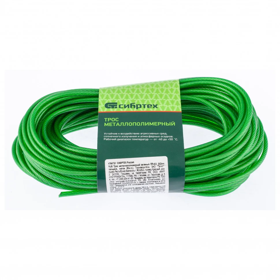 Крепежный инструмент » Сибртех Трос металлополимерный зеленый ПР-4.0, толщина 4.0 мм, моток 20 метров Россия 476473