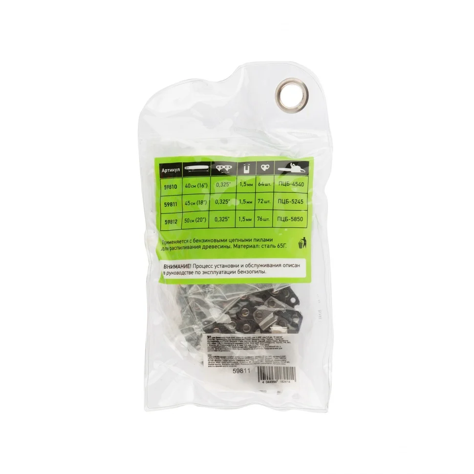 Цепь Сибртех 59811 используется в качестве сменного режущего элемента для бензопилы Сибртех ПЦБ-5245. Состоит из 72 звеньев с шагом 0,325"" и шириной паза 1,5 мм, поэтому идеально подходит для частного применения в бытовых условиях, на небольших стройках, в лесу, на рыбалке и в походах. Совместима с шинами длиной 45 см (18""). Пилу с такой цепью удобно удерживать в руках благодаря низкому уровню вибраций.ПреимуществаПрочность и устойчивость к ударным нагрузкам — цепь произведена из высококачественной стали 65Г.Защита от влаги — антикоррозионное напыление предотвращает разрушение цепи и позволяет использовать ее для распиловки льда.Простое обслуживание — серпообразный профиль звеньев облегчает заточку и делает фурнитуру более устойчивой к загрязнениям.Высокая эффективность — благодаря лазерной заточке цепь долго сохраняет остроту и позволяет добиться идеально ровного распила.Высокий рабочий ресурс — в процессе работы цепь автоматически смазывается маслом.Безопасная транспортировка и хранение — цепь поставляется в плотном пакете, защищающем пользователя от травм и препятствующем загрязнению.Продуманная упаковка — можно приобрести сразу несколько пакетов с цепями и хранить их удобным способом, например, подвесив за металлические кольца.
