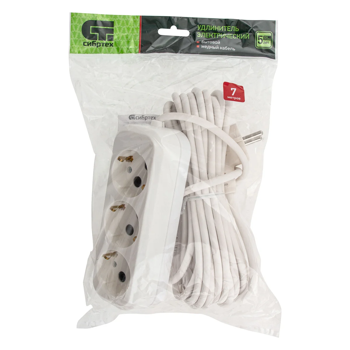 Белый бытовой удлинитель Сибртех 96068, тип УХз-10, 10 А, с заземлением, имеет 3 розетки для подключения бытовых и осветительных приборов на расстоянии до 7 м от источника электроснабжения. Медный кабель рассчитан на нагрузку не более 2200 Вт. Удлинитель удобен для бытового применения.ПреимуществаКорпус выполнен из прочного и износостойкого пластика, что обеспечивает долговечность изделия.Двойная оболочка из ПВХ надежно защищает кабель от повреждений.Заземляющие контакты розеток обеспечивают защиту пользователя от поражения электрическим током.Сетевой удлинитель изготовлен из негорючих материалов, что соответствует требованиям ТР ТС 004/2011.