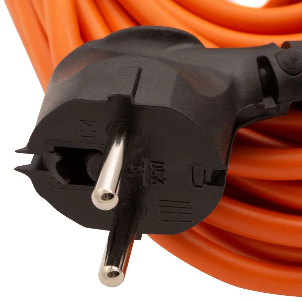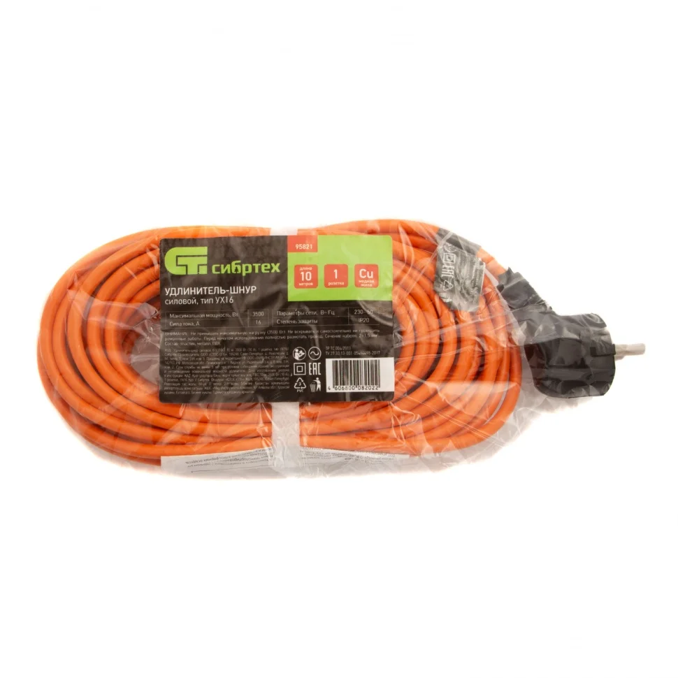 Силовой удлинитель-шнур Сибртех 95821 длиной 10 м, 16 А, тип УХ16, кабель ПВС, 1 розетка без заземления, служит для дистанционного подключения электроприборов к источнику питания. Удобен для работы с режущим инструментом. Крученый медный кабель рассчитан на нагрузку до 3500 Вт. Легкие и прочные вилка и розетка имеют корпус из негорючего пластика и выдерживают длительное использование. Сетевой удлинитель пригодится во время строительных работ, будет полезен на дачном участке или в автомастерской.ПреимуществаКабель в двойной ПВХ-оболочке устойчив к повреждениям в результате механических воздействий и изгибов.Яркий оранжевый кабель хорошо виден даже в условиях плохого освещения, а также среди строительного мусора и в густой растительности.Намотанный «бубликом» удлинитель упакован в термоусадочную пленку для удобства хранения и транспортировки.Изделие имеет сертификат соответствия ТР ТС 004/2011, что подтверждает его надежность.