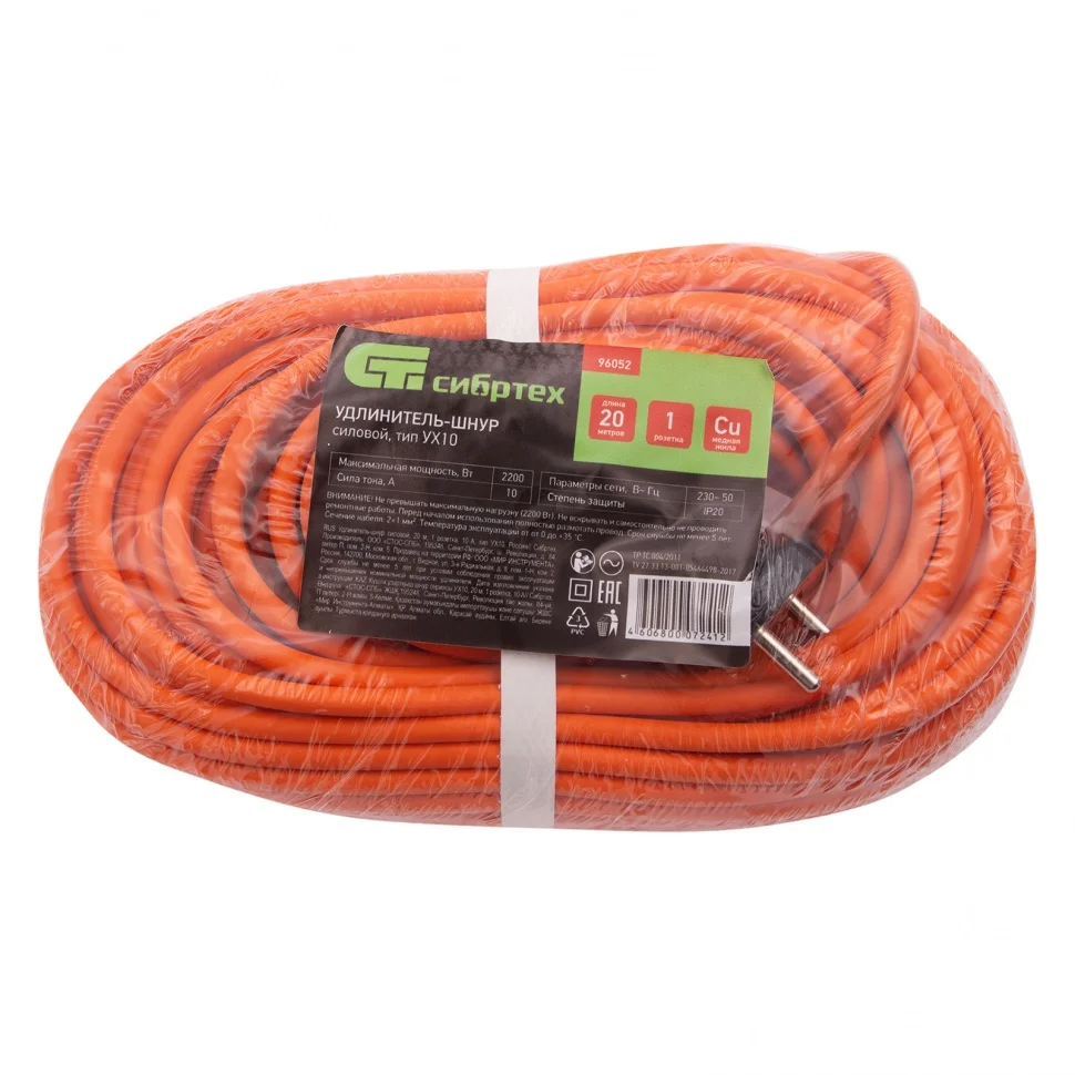 Силовой удлинитель-шнур Сибртех 96052, тип УХ10, 10 A, с 1 розеткой, позволяет подключать к электросети электроприборы мощностью до 2200 Вт на расстоянии до 20 м от источника электроснабжения. Яркий оранжевый кабель хорошо заметен даже в густой траве и среди строительного мусора. Сетевой удлинитель используется во время строительных и монтажных работ, а также пригодится дома, на даче или в гараже.ПреимуществаКорпус розетки и вилки выполнен из негорючего пластика, что обеспечивает им прочность и долговечность.Крученый медножильный кабель покрыт двойной ПВХ-оболочкой, поэтому устойчив к повреждению в результате многократных изгибов и механических воздействий.Намотка «бубликом» удобна для хранения и транспортировки.Удлинитель имеет сертификат соответствия требованиям ТР ТС 004/2011, что подтверждает его надежность.