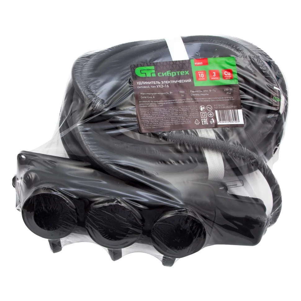 Удлинитель силовой 10 м, 16 А, тип УХз16, 3 x 1.5 мм, Россия Сибртех 95885