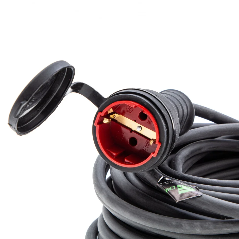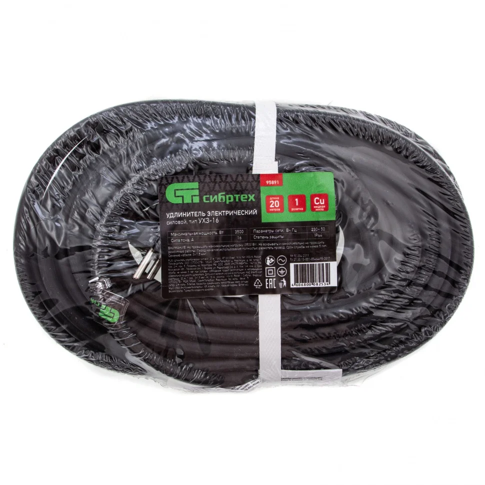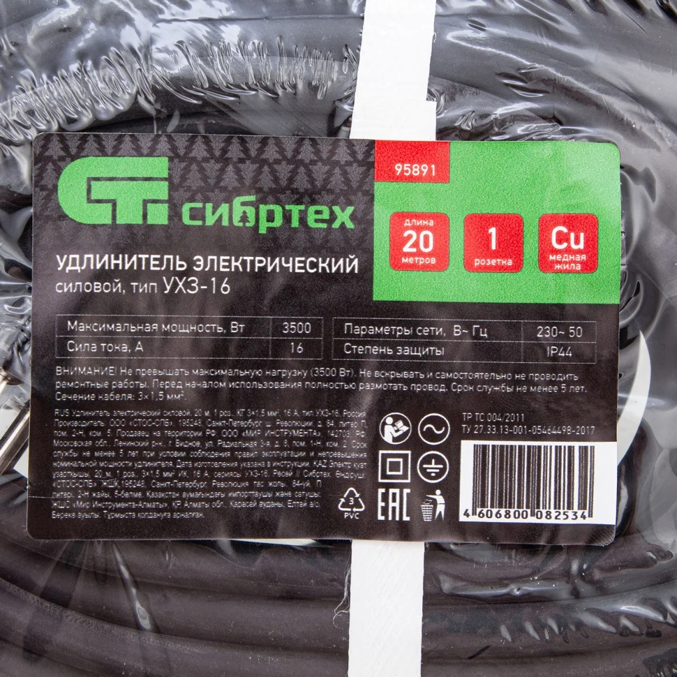 Силовой удлинитель Сибртех 95891, тип УХЗ-16, 16 А, тип кабеля КГ 3 х 1,5 мм, с 1 розеткой, позволяет подключать электрооборудование к сети на расстоянии до 20 м от стационарного источника электроснабжения. Медножильный кабель выдерживает нагрузку до 3500 Вт и рассчитан на длительное использование. Розетка закрывается защитной крышкой, предотвращающей попадание грязи и влаги на разъемы. Сетевой удлинитель используется в строительстве и на производстве.ПреимуществаКорпус розетки изготовлен из ударопрочного пластика, устойчивого к механическим повреждениям.Вилка изготовлена из каучука, что снижает риск получения электротравмы.Заземляющий контакт защищает пользователя от воздействия электрического тока.Двойная резиновая оболочка кабеля обеспечивает ему защиту от повреждений, истирания и абразивного воздействия.Кабель выдерживает температуру от -40 до +50 градусов, что позволяет использовать его зимой на улице или в неотапливаемом помещении.Удлинитель имеет класс защиты IP44, поэтому его можно применять в условиях высокой влажности.Изделие имеет сертификат соответствия ТР ТС 004/2011, что подтверждает его высокое качество.