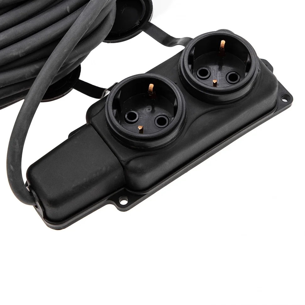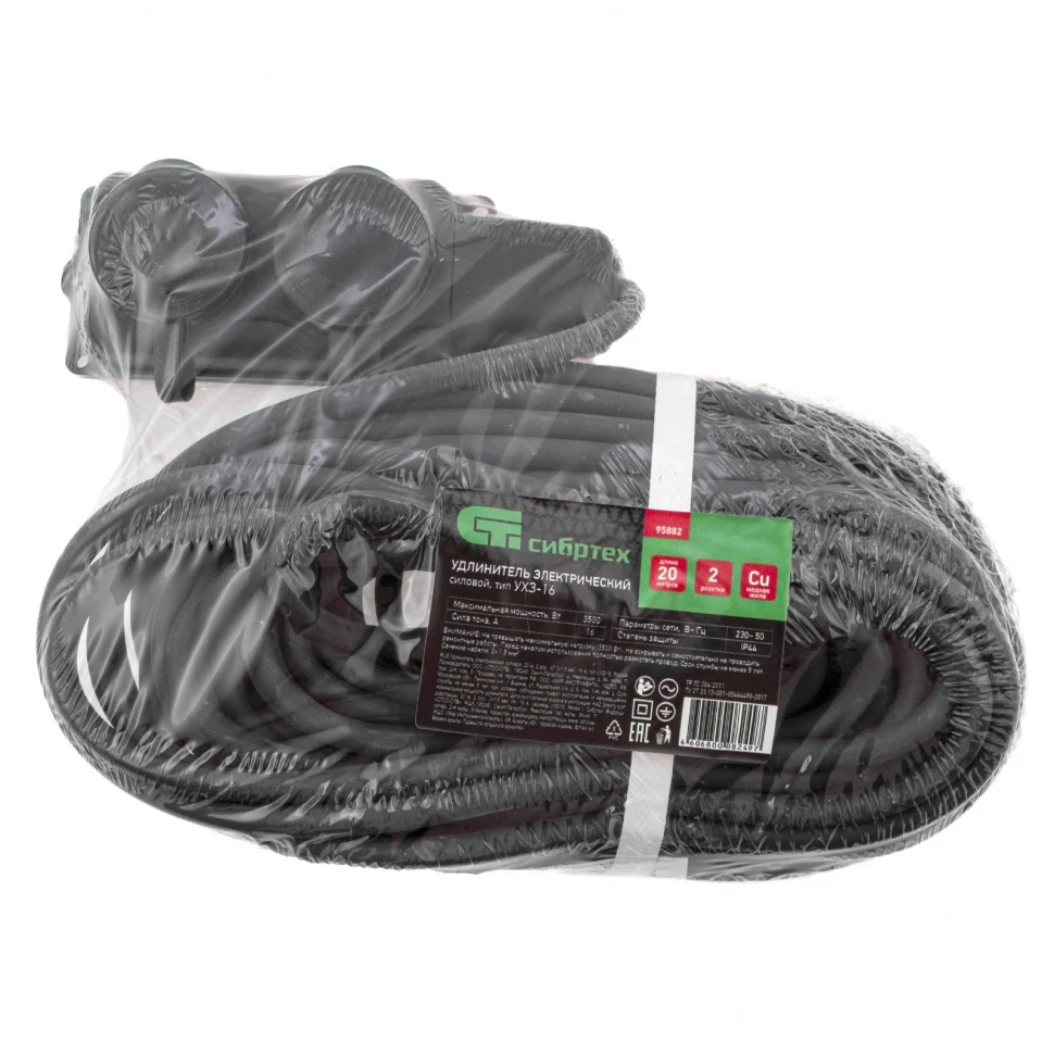 Силовой удлинитель Сибртех 95882, тип УХЗ-16, 16 А, тип кабеля КГ 3 х 1,5 мм, с 2 розетками, позволяет подключать электрооборудование к сети на расстоянии до 20 м от стационарного источника электроснабжения. Медножильный кабель выдерживает нагрузку до 3500 Вт и рассчитан на длительное использование. Розетки закрываются защитными крышками, предотвращающей попадание грязи и влаги на разъемы. Сетевой удлинитель используется в строительстве и на производстве.ПреимуществаКорпусы розеток изготовлены из ударопрочного пластика, устойчивого к механическим повреждениям.Вилка изготовлена из каучука, что снижает риск получения электротравмы.Заземляющий контакт защищает пользователя от воздействия электрического тока.Двойная резиновая оболочка кабеля обеспечивает ему защиту от повреждений, истирания и абразивного воздействия.Кабель выдерживает температуру от -40 до +50 градусов, что позволяет использовать его зимой на улице или в неотапливаемом помещении.Удлинитель имеет класс защиты IP44, поэтому его можно применять в условиях высокой влажности.Изделие имеет сертификат соответствия ТР ТС 004/2011, что подтверждает его высокое качество.